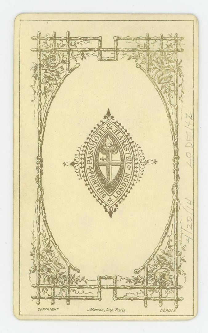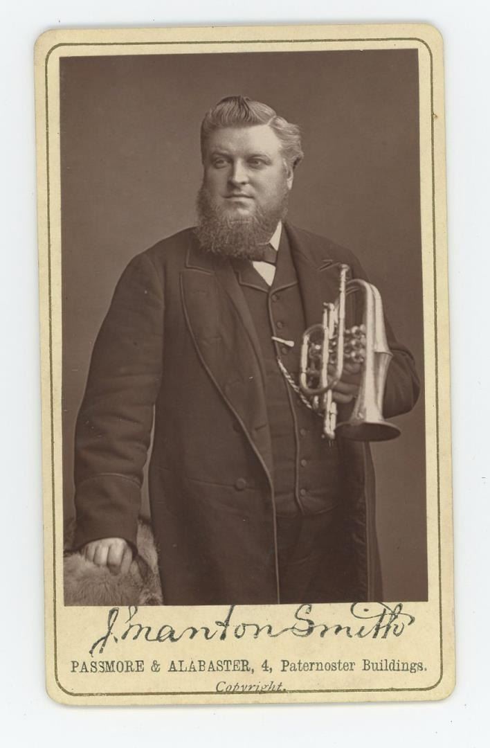 2 1/4" by 4". Baptist preacher Joseph Manton-Smith (1844-1900) with his silver cornet.A personal friend of the Reverend Charles Haddon Spurgeon, Manton-Smith assisted CHS in establishing his orphanage at Stockwell in 1867. Manton-Smith later wrote about his life-long friendship with Spurgeon and the founding of the school in two books, published in the 1880s and 1890s, called Stray Leaves and More Stray Leaves . He also describe how he had originally been torn between his ministry and the music hall. He had appeared in fact appeared in the music halls of the East End but decided to put his musical talents to other uses, such as fundraising for the poor and for the Ragged Schools of East London. Photographed by Passmore and Alabaster of London.
