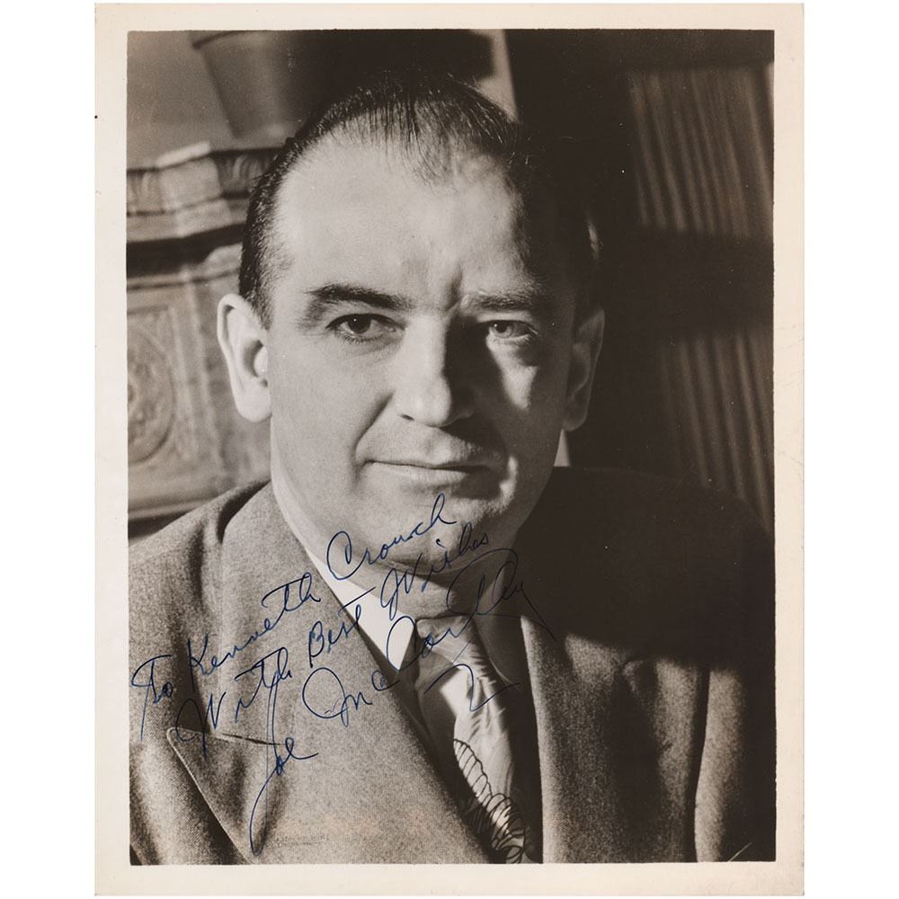 Vintage glossy 8 x 10 close-up photo of the Communist-hunting Senator McCarthy in a suit and tie, signed and inscribed in fountain pen, "To Kenneth Crouch, With Best Wishes, Joe McCarthy.†In fine condition, with a light paperclip impression to the top edge.