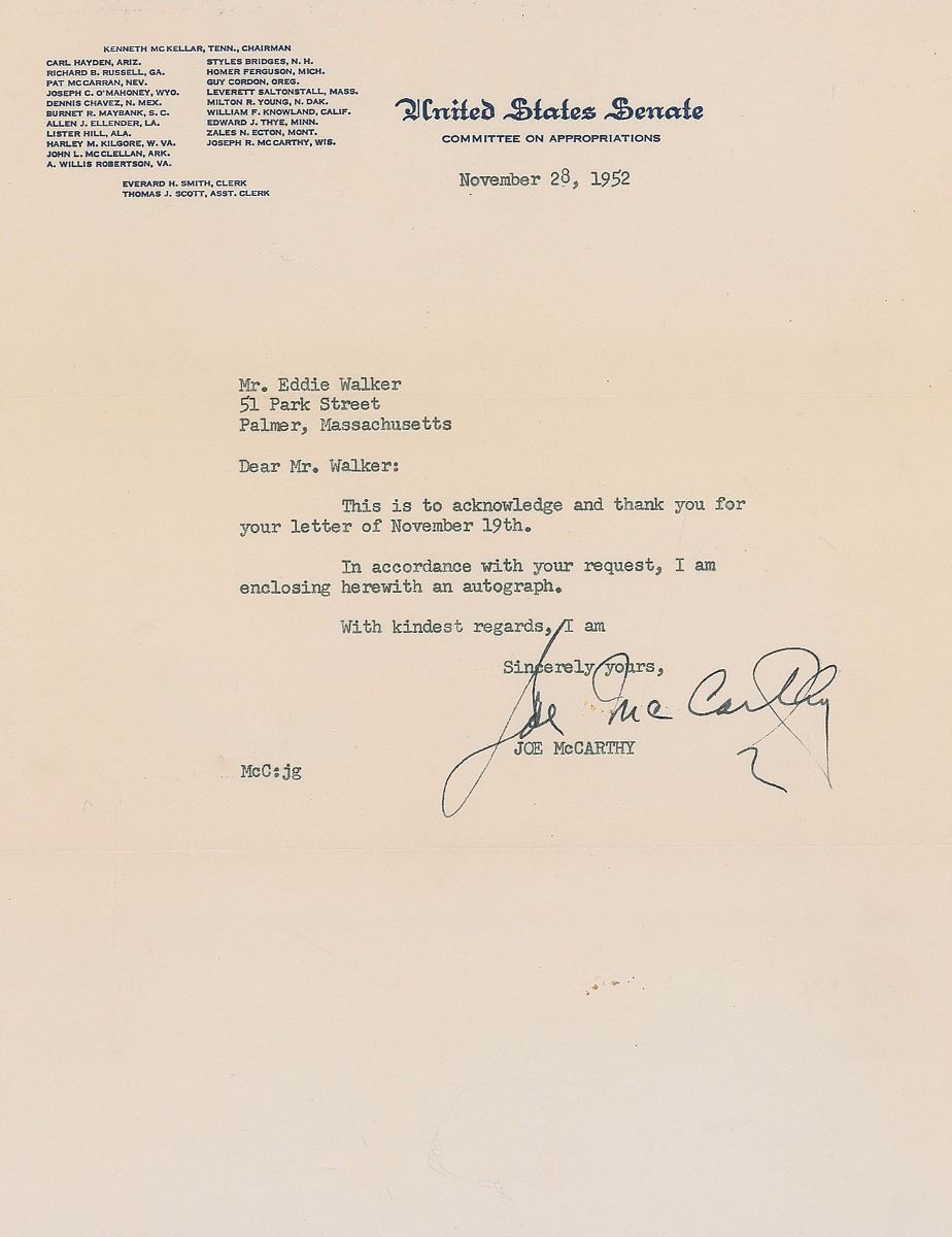 TLS signed “Joe McCarthy,” one page, 8 x 10.5, United States Senate letterhead, November 28, 1952. Letter to Eddie Walker, in full: “This is to acknowledge and thank you for your letter of November 19th. In accordance with your request, I am enclosing herewith an autograph.” In fine condition, with a few spots of soiling, and a light paperclip impression to top edge.