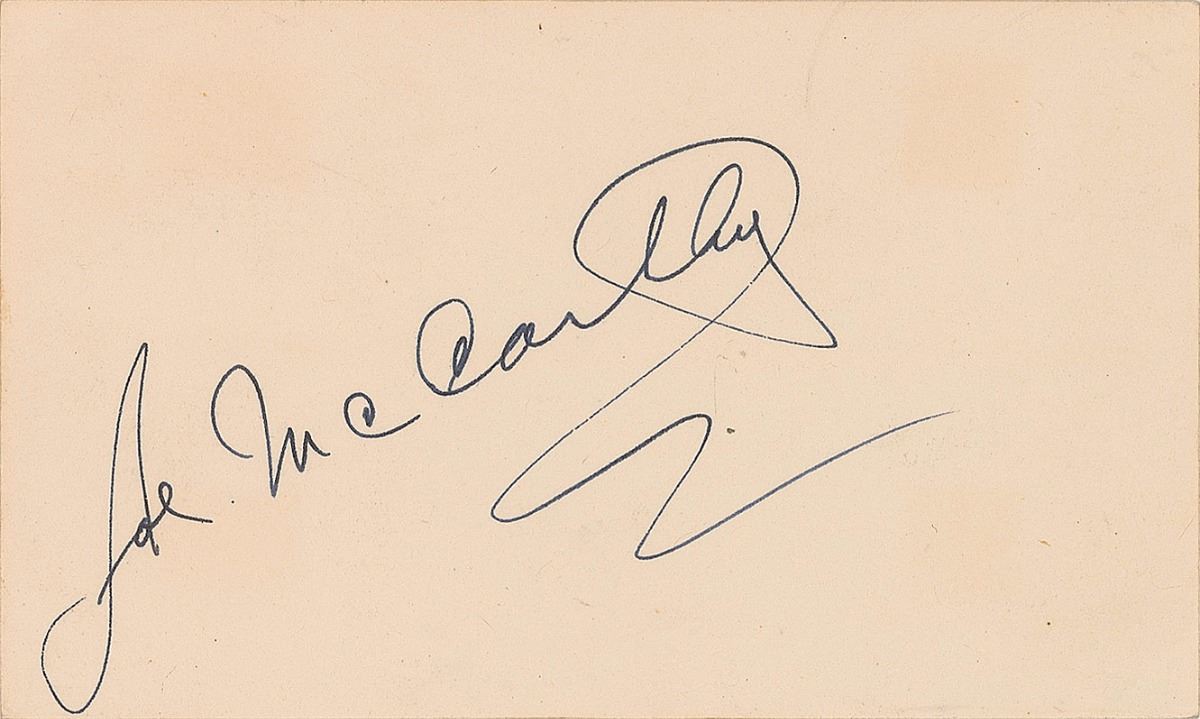 Reviled American legislator (1908–1957) whose dogged pursuit and persecution of would-be Communists in the early 1950s remains one of the most notorious episodes in the annals of American government. Vintage fountain pen signature, “Joe McCarthy,” on an off-white 5 x 3 card. In fine condition. Pre-certified PSA/DNA.