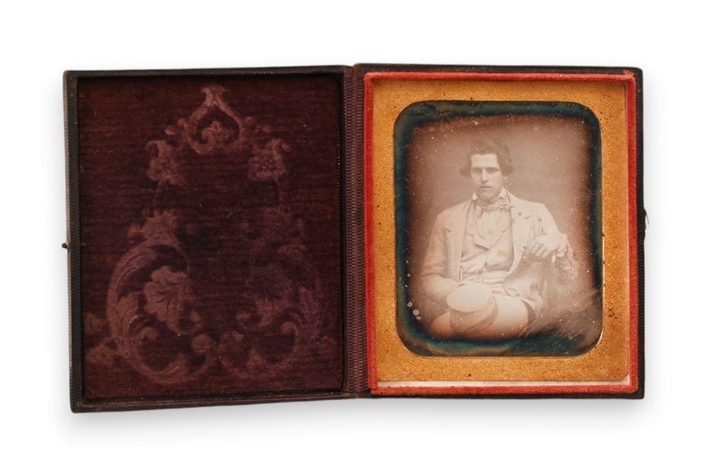 From the John Coffee Hays, Applewhite-Clark Collection. Ambrotype of Joseph Moravia Moss, San Francisco banker and business associate of Hays. Moss built a fortune in banking, ice and fur importing, railroad building and telegraph and gas utilities. He served on the University of California Board of Regents and was the President of the Board of Trustees of the California State Asylum for the Deaf, Dumb and Blind (precursor of the California School for the Deaf and Blind). John C. Hays was also a member of both of these boards. (1/6 plate). Ambrotype circa 1855, 2.75" x 3.25"