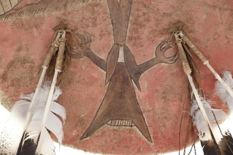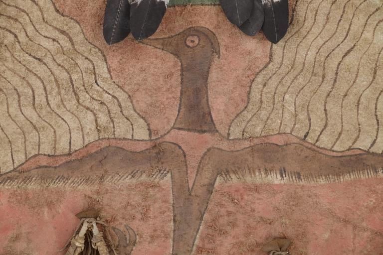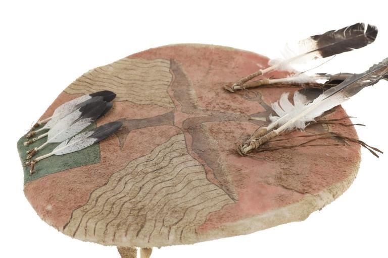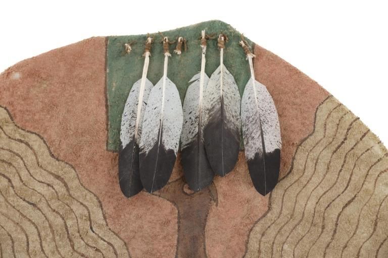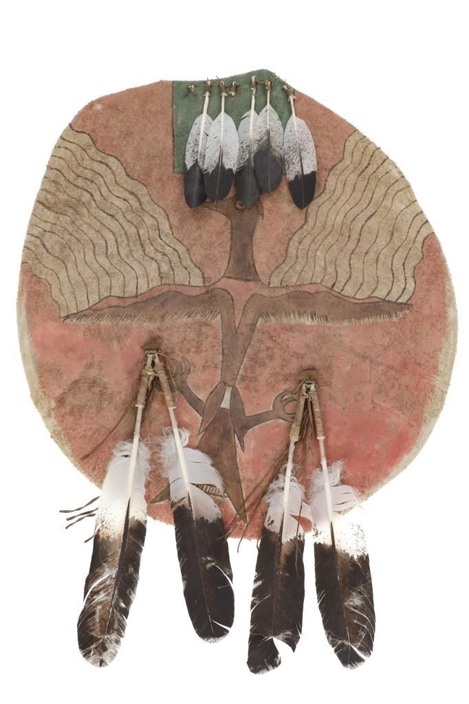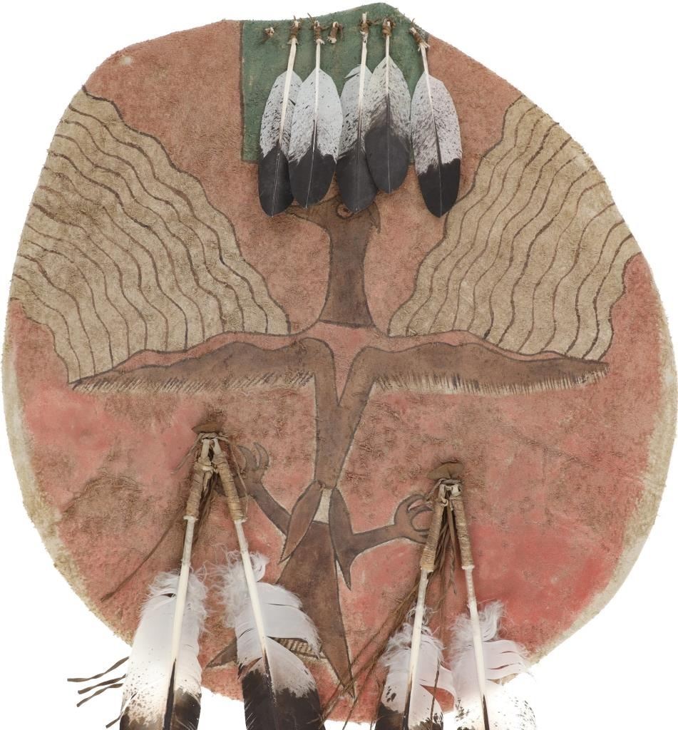 The lot features a painted hide shield cover depicting a bird on a red ground with waved lines radiating inspired by the historic shields from He Nupa Wanica / Joseph No Two Horns (1852-1942). Joseph No Two Horns (He Nupa Wanica, 1852-1942) was a prolific artist and skilled warrior, having fought in around 40 battles, including the Battle of the Little Bighorn. No Two Horns was a Hunkpapa Lakota / Teton Sioux warrior well-known for his iconic Thunderbird shield’s that he created throughout his entire life. Examples of No Two Horns' painted hide shields can be found in the collections of the Denver Art Museum (1932.237); the Detroit Institute of the Arts (2006.106); and the Charles and Valerie Diker Collection (691), a promised gift to the Metropolitan Museum of Art of New York City (L.2018.35.69).