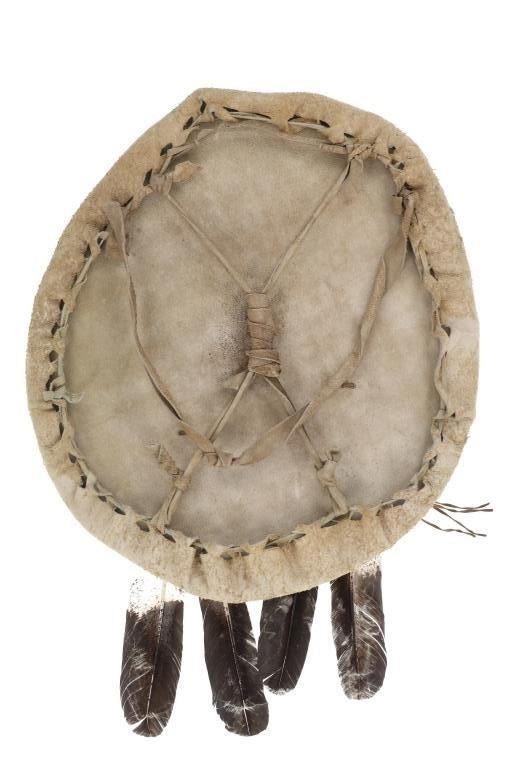 "In the relatively short period of the horse culture of the Plains Indian tribes, one of the most important objects a nomadic warrior might carry into battle was his shield... while they could deflect arrows or glancing blows, it was the vision-inspired paintings on the shield or hide covers that the owners believed offered them the greatest protection". Wooley and Horse Capture, "Joseph No Two Horns / He Nupa Wanica", American Indian Art Magazine, Summer 1993, Goldfein, Roanne P., Vol 18, Number 3, p. 32-43 (Bonhams; Ingmars Lindbergs).