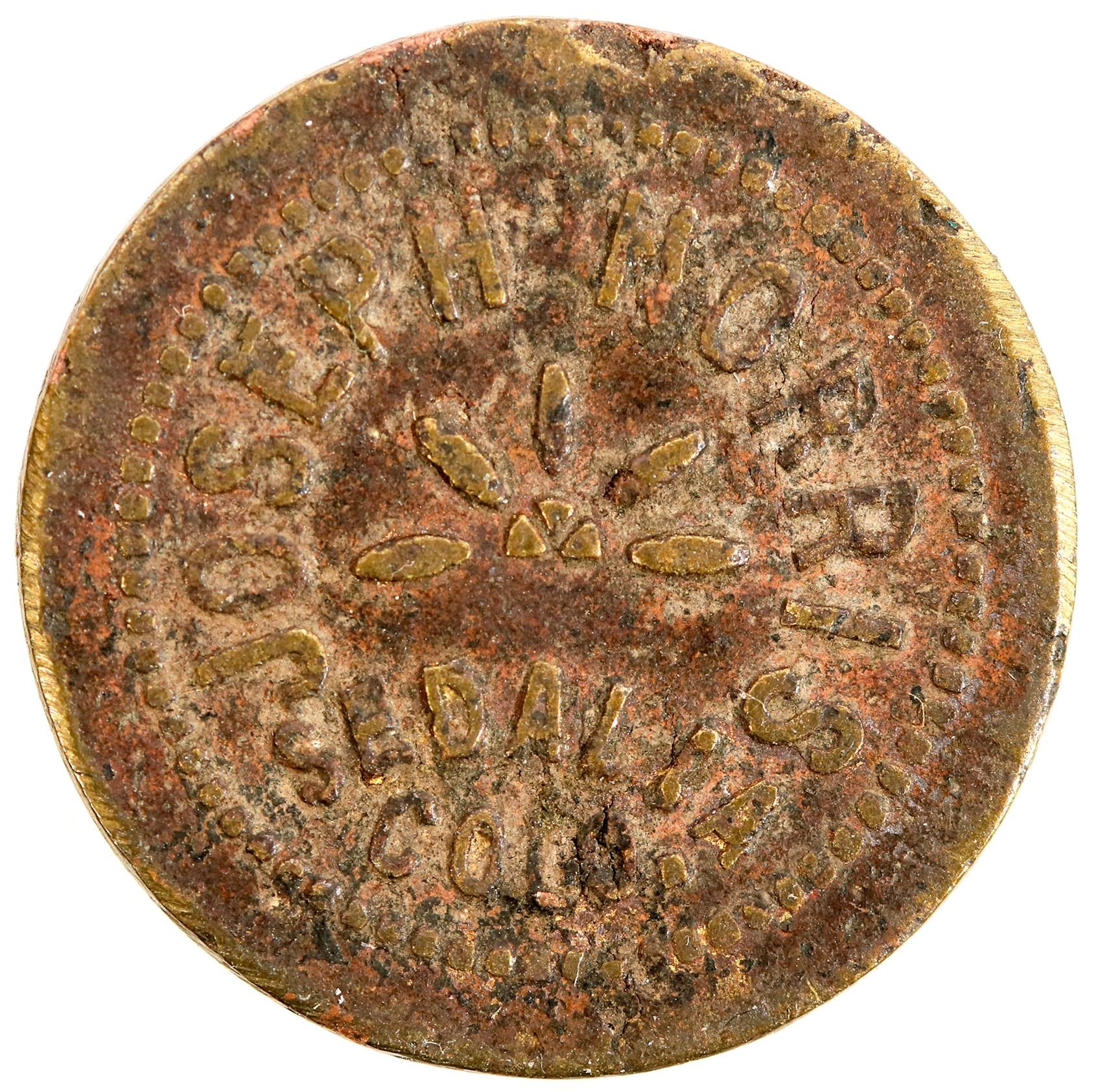 Extremely rare 1908 Saloon in the Douglas County town of Sedalia: JOSEPH NORRIS / SEDALIA / COLO. // GOOD FOR / 5c / IN TRADE; Br., rd., 21 mm.