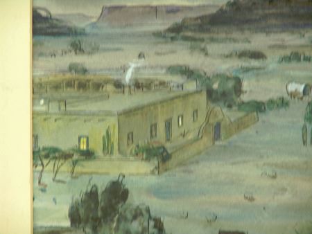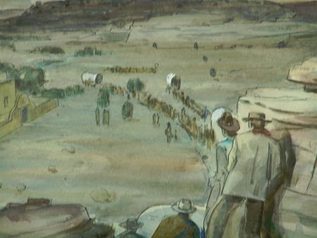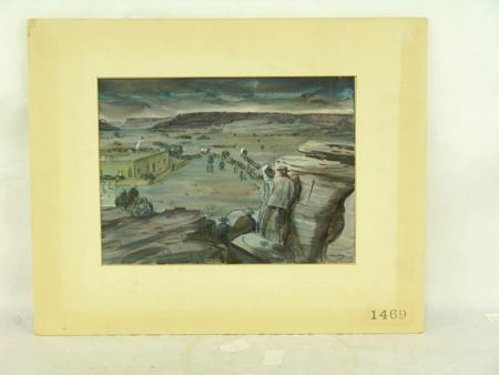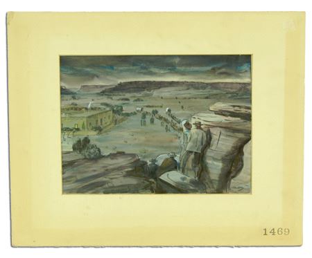 Late 1940s, Signed original watercolor featuring a scene from MGM's 1950 movie "The Outriders" (starring Joel McCrea and Arlene Dahl), a "story scene" done while in their employ in the late 1940s. Very good condition. 10" x 13" (16" x 21" framed)
