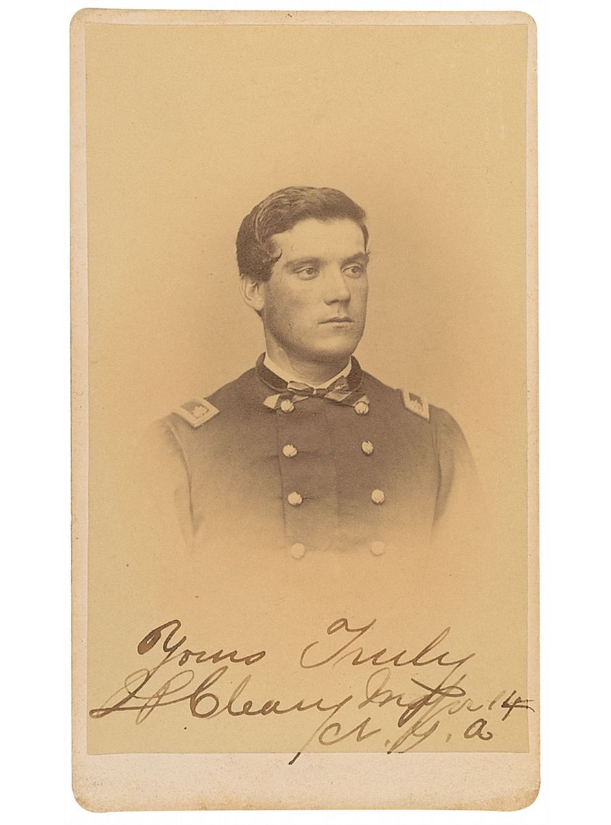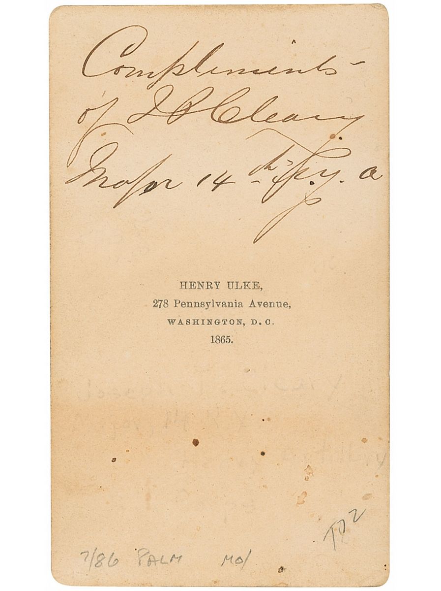Major in the 14th New York Heavy Artillery. Original 2.25 x 4 carte-de-visite photo by Henry Ulke of Washington, D. C., signed below his image in black ink, “Yours truly, J. P. Cleary, N.Y.A.,” and signed again on the reverse. In fine condition, with some light wear to bottom edge.