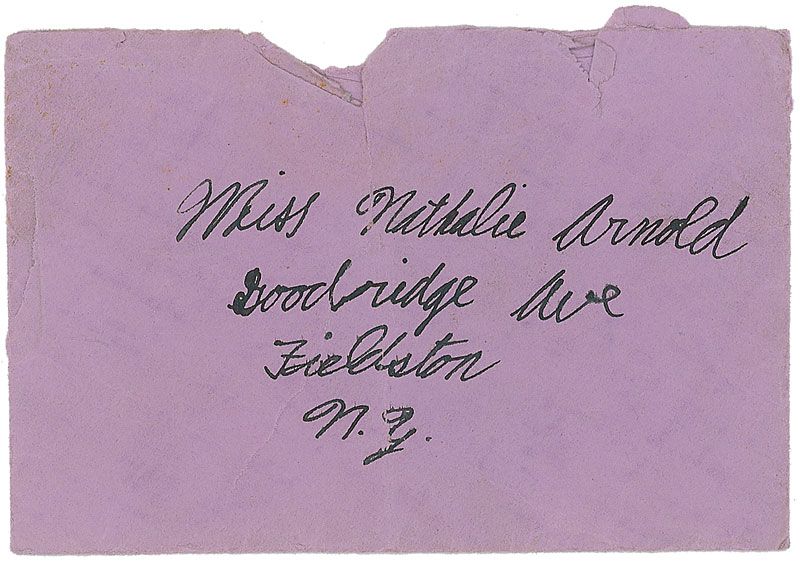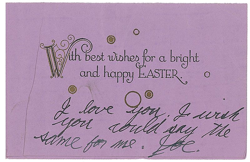 Brother (1915–1944) of John F. Kennedy who served as a bomber pilot during WWII; he was tragically killed due to an airplane malfunction while flying a secret mission. Purple Easter card signed “Joe,” from 1928, measuring 4 x 2.75 closed and 8.25 x 2.75 open, bearing a printed sentiment and ANS from Kennedy inside, in full: “I love you. I wish you could say the same for me.” Includes the original transmittal envelope, addressed in Kennedy’s hand. Some scattered creases and a tear to the envelope, otherwise fine condition. Accompanied by a letter of provenance from the previous owner, stating that her mother, Nathalie Arnold, received this from Kennedy when she was 14 and he was 13; the sentiment resulted from a neighborhood game they played as children with active imaginations. This particular signed and handwritten card conveys a poignant and unique glimpse of an infatuated Joseph Kennedy Jr., hoping that a teenage romance would blossom during the Easter period of 1928. Anything signed by the ill-fated older brother of JFK is exceedingly rare, and this is one the limited few we have offered.