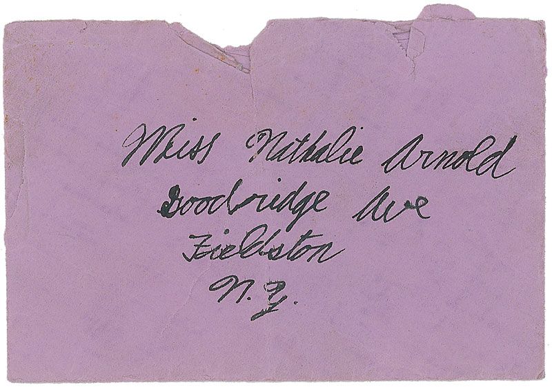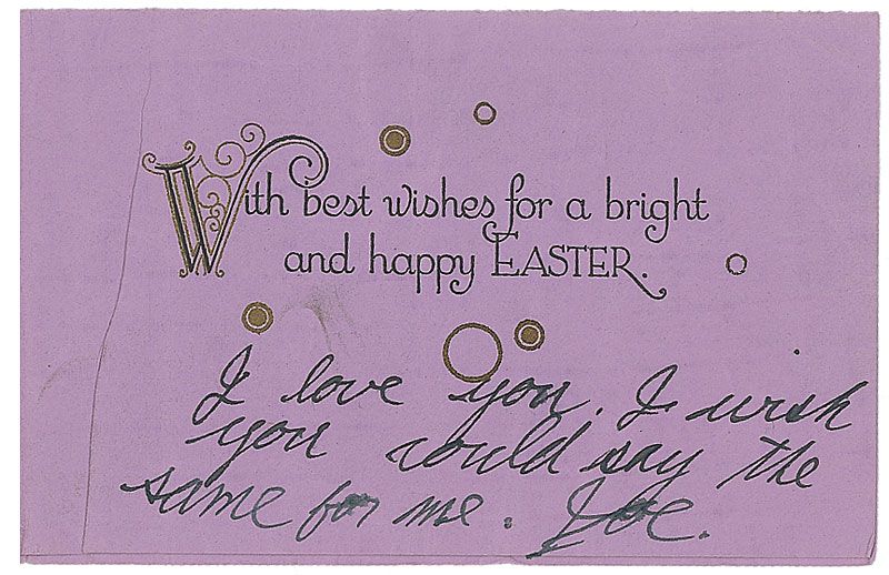 Brother (1915–1944) of John F. Kennedy who served as a bomber pilot during WWII; he was tragically killed due to an airplane malfunction while flying a secret mission. Purple Easter card signed “Joe,” from 1928, measuring 4 x 2.75 closed and 8.25 x 2.75 open, bearing a printed sentiment and ANS from Kennedy inside, in full: “I love you. I wish you could say the same for me.” Includes the original transmittal envelope, addressed in Kennedy’s hand. Some scattered creases and a tear to the envelope, otherwise fine condition. Accompanied by a letter of provenance from the previous owner, stating that her mother, Nathalie Arnold, received this from Kennedy when she was 14 and he was 13; the sentiment resulted from a neighborhood game they played as children with active imaginations. This particular signed and handwritten card conveys a poignant and unique glimpse of an infatuated Joseph Kennedy, Jr., hoping that a teenage romance would blossom during the Easter period of 1928. Anything signed by the ill-fated older brother of JFK is exceedingly rare, and this is one the limited few we have offered.