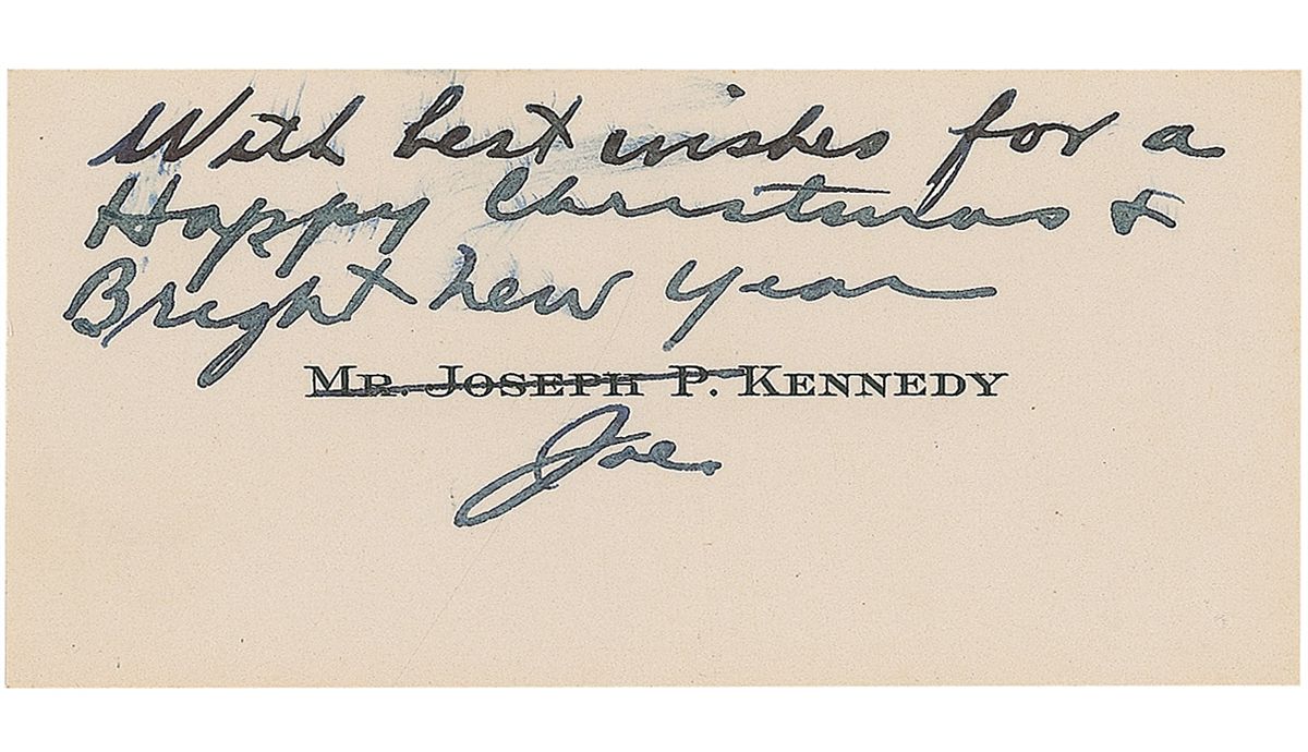 One of the Kennedy patriarch’s scarce personal calling cards, 3 x 1.5, signed in black ink, “With best wishes for a Happy Christmas & Bright New Year,” with Kennedy crossing out his printed first name, and signing underneath, “Joe.” In fine condition, with a couple slight brushes to sentiment. Of particular interest to the advanced Kennedy collector, as this format is exceedingly uncommon.