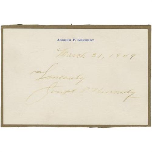 <B>Joseph P. Kennedy Signed Card,</B></I> 5.5" x 3.5", on personalized note card, March 31, 1949, mounted on art board. Kennedy (1888-1969) was a prominent United States businessman and political figure, the father of President John F. Kennedy and Senators Robert F. Kennedy and Ted Kennedy. As a leading American Democrat, especially in the Irish Catholic community, and with business interests and connections nationwide, he built the political fortunes of the Kennedy political family. Faded else good. <BR><BR><b>Shipping:</b> Flat Material, Small (<a target="_blank" href="http://www.heritageauctions.com/common/shipping.php">view shipping information</a>\)