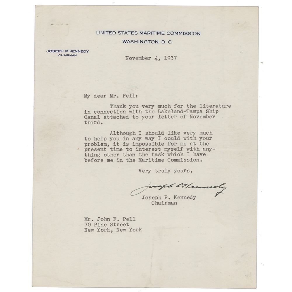 Patriarch of the fabled family of American politicians (1888–1969) who served as American ambassador to Great Britain from 1938 to 1940. TLS, one page, 7 x 8.75, United States Maritime Commission letterhead, November 4, 1937. Letter to John F. Pell, in full: "Thank you very much for the literature in connection with the Lakeland-Tampa Ship Canal attached to your letter of November third. Although I should like very much to help you in any way I could with your problem, it is impossible for me at the present time to interest myself with anything other than the task which I have before me in the Maritime Commission." In fine condition, with staple holes to the upper left corner.