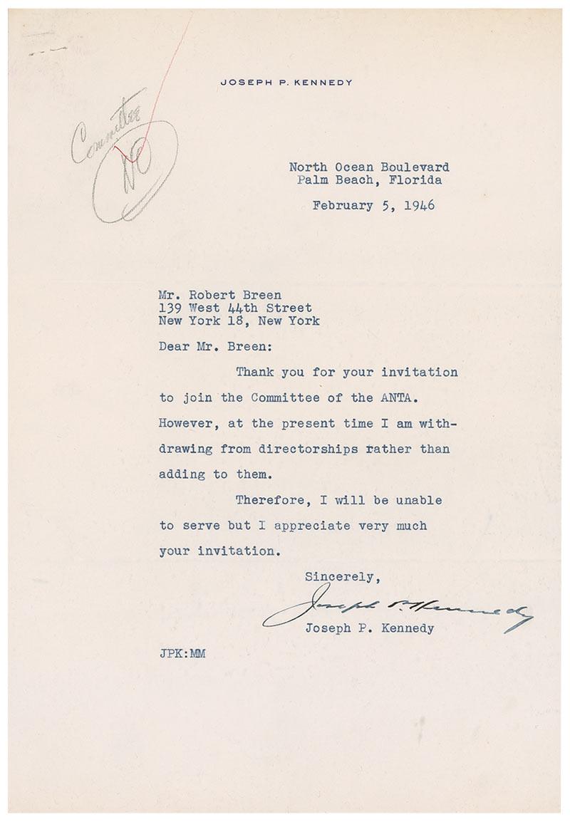 Patriarch of the fabled family of American politicians (1888–1969) who served as American ambassador to Great Britain, from 1938 to 1940. TLS, one page, 7.25 x 10.5, personal letterhead, February 5, 1946. Kennedy turns down a seat on the American National Theatre and Academy committee. In full: “Thank you for your invitation to join the Committee of the ANTA. However, at the present time I am withdrawing from directorships rather than adding to them. Therefore, I will be unable to serve but I appreciate very much your invitation.” A secretarial notation appears near the top left corner. In fine condition, with light wrinkling, staple hole at the upper left corner, and light toning. Accompanied by a copy of the invitation sent to Kennedy.