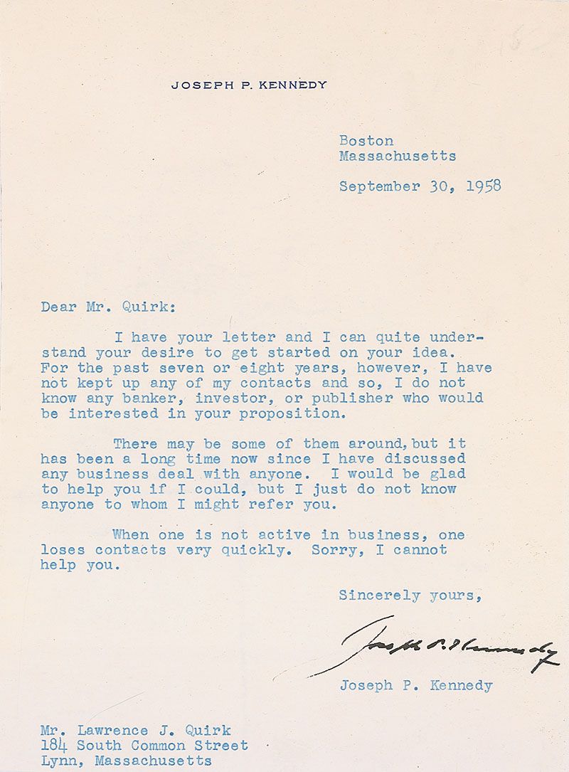 TLS, one page, 6.25 x 8.5, personal letterhead, September 30, 1958. Letter to a man seeking help from Kennedy’s contacts. In full: “I have your letter and I can quite understand your desire to get started on your idea. For the past seven or eight years, however, I have not kept up any of my contacts and so, I do not know any banker, investor, or publisher who would be interested in your proposition. There may be some of them around, but it has been a long time now since I have discussed any business deal with anyone. I would be glad to help you if I could, but I just do not know anyone to whom I might refer you. When one is not active in business, one loses contacts very quickly. Sorry, I cannot help you.” In fine condition, with a slightly trimmed bottom edge.