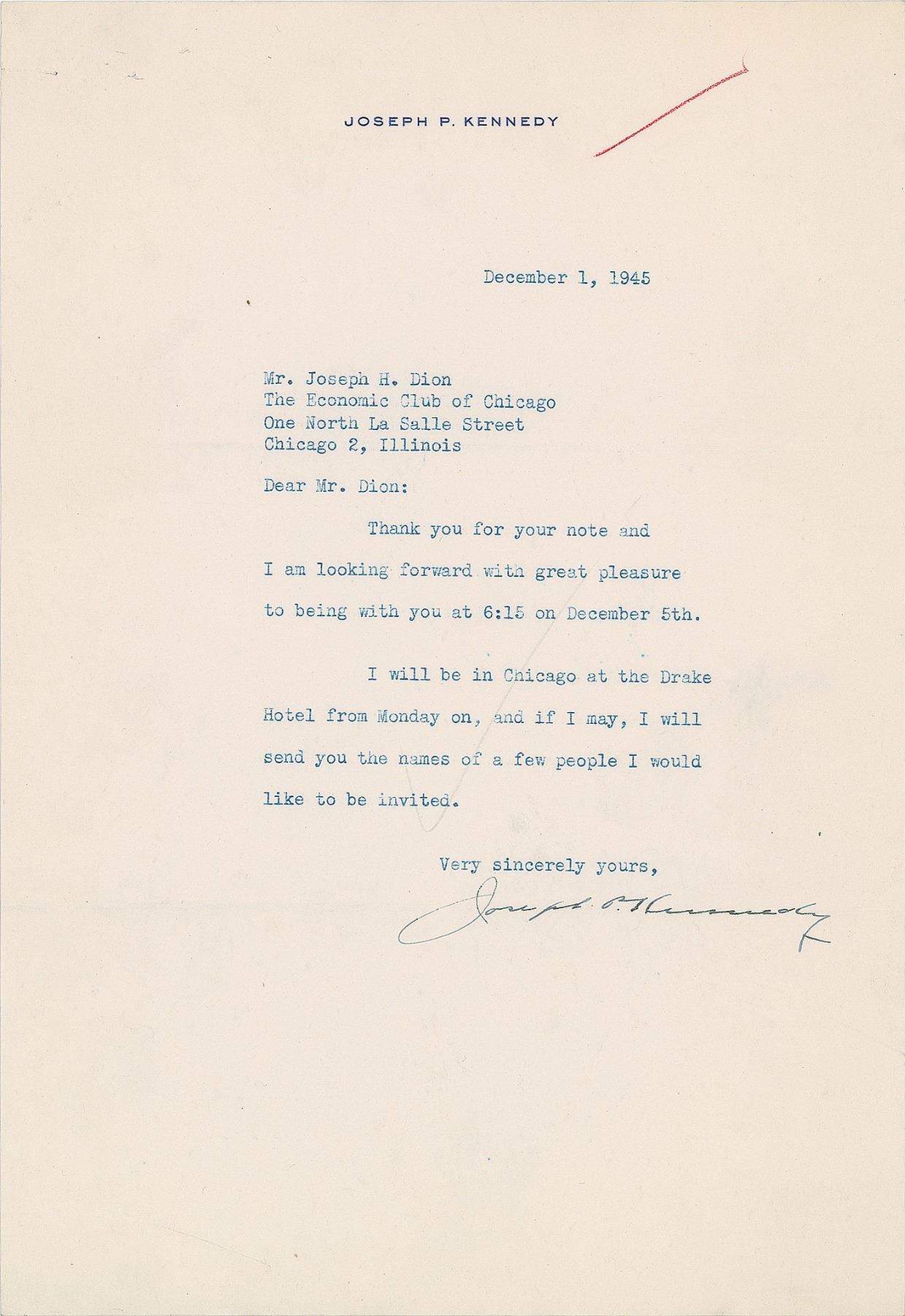 TLS, one page, 7.25 x 10.5, personal letterhead, December 1, 1945. Letter to Joseph H. Dion of the Economic Club of Chicago, in full: "Thank you for your note and I am looking forward with great pleasure to being with you at 6:15 on December 5th. I will be in Chicago at the Drake Hotel from Monday on, and if I may, I will send you the names of a few people I would like to be invited." In fine condition, with creasing to the bottom and staple holes to the top.