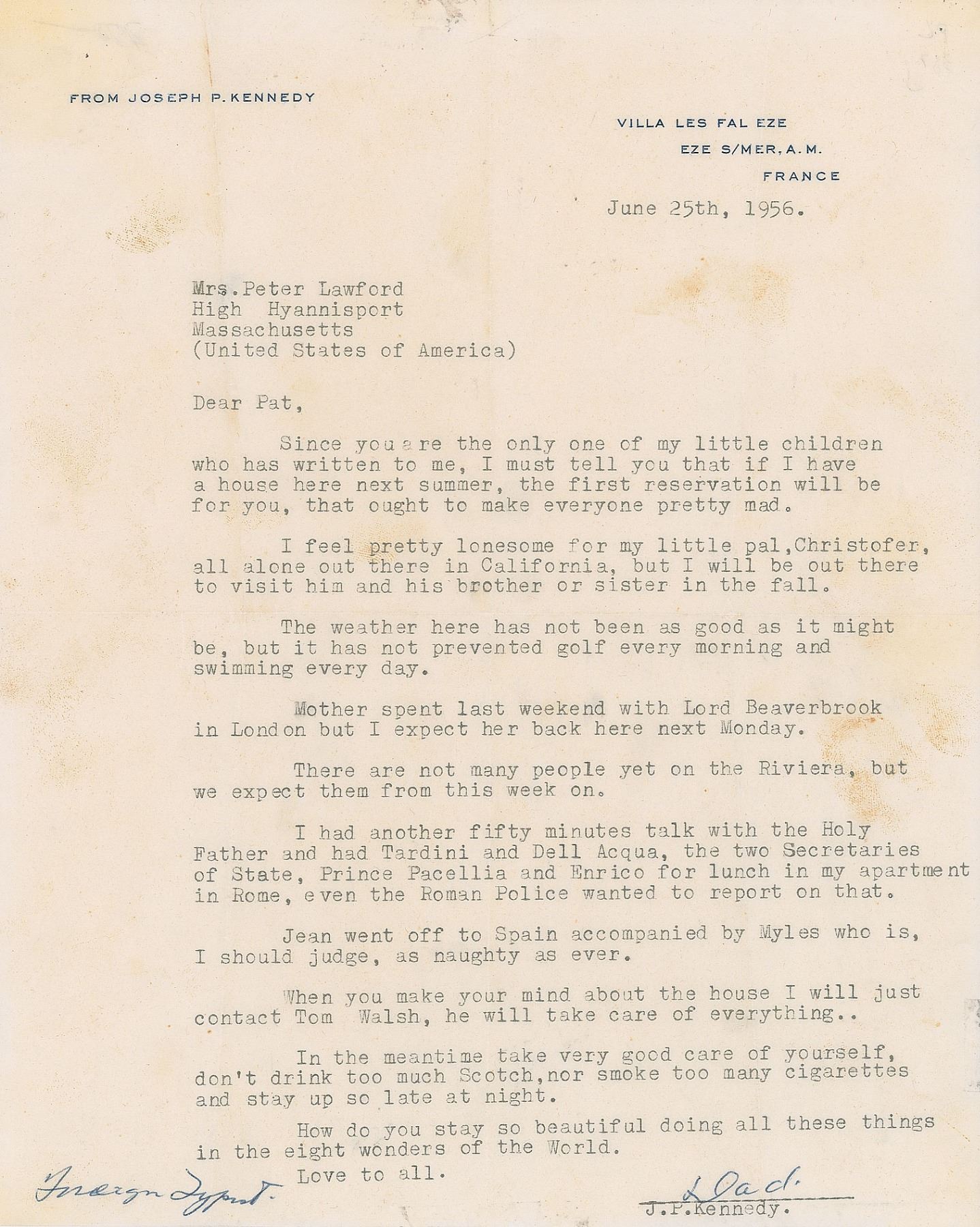 TLS signed "Dad," one page, 8 x 10, personal letterhead, June 25, 1956. Letter to his daughter, Patricia Kennedy, addressed to "Mrs. Peter Lawford," in part, "Since you are the only one of my little children who has written to me, I must tell you that if I have a house here next summer, the first reservation will be for you, that ought to make everyone pretty mad…The weather here has not been as good as it might be, but it has not prevented golf every morning and swimming every day. Mother spent last weekend with Lord Beaverbrook in London but I expect her back here next Monday. There are not many people yet on the Riviera, but we expect them from this week on. I had another fifty minutes talk with the Holy Father and had Tardini and Dell Acqua, the two Secretaries of State, Prince Pacellia and Enrico for lunch in my apartment in Rome, even the Roman Police wanted to report on that…In the meantime take very good care of yourself, don't drink too much Scotch, nor smoke too many cigarettes and stay up so late at night. How do you stay so beautiful doing all these things in the eight wonders of the World." In very good condition, with intersecting folds, light creasing, and scattered light stains. Accompanied by the original mailing envelope.