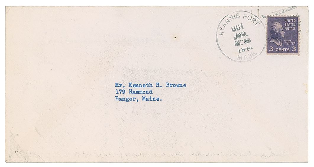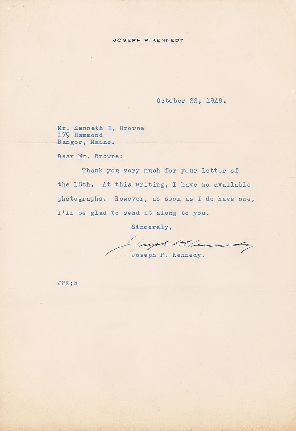 TLS, one page, 7.25 x 10.5, personal letterhead, October 22, 1948. Letter to Kenneth Browne in Maine, in part: "At this writing, I have no available photographs. However, as soon as I do have one, I'll be glad to send it along to you." In fine condition, with faint edge toning, and staple holes to the upper left corner. Accompanied by the original mailing envelope.