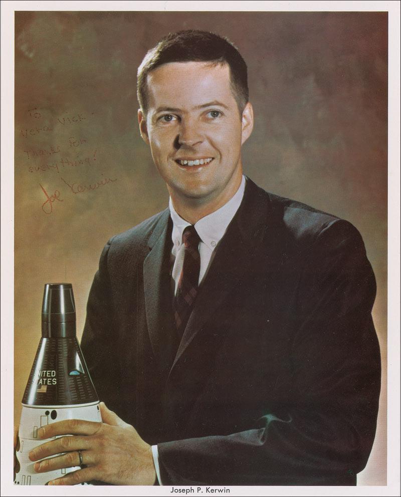 Color vintage 8 x 10 NASA photo, signed and inscribed in black felt tip “To Vera Vick, Thanks for everything! Joe Kerwin.” In very good condition, with irregular adhesion to signature and inscription, which is fairly light, but mostly legible. The recipient, Vera Vick, was a NASA employee.