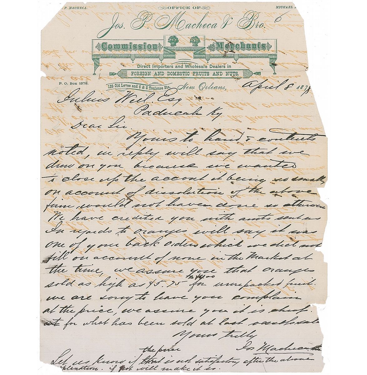 Fruit importer considered by many the first Mafia don in the US and an originator of organized crime (1843–1891). He was one of many suspects accused of the murder of New Orleans police chief David Hennessy, and after being acquitted at trial, Macheca and ten others were lynched by an enraged crowd. Rare ALS signed “Jos. Macheca,” one page, 8.5 x 11, personal letterhead, New Orleans, April 8, 1878. Letter to Julius Weil. In part: “In regards to oranges will say it was one of your back orders which we did not fill on account of none in the market at the time, we assure you that oranges sold as high as $5.95 to $6.00 for unrepacked fruit. We are sorry to have you complain at the price, we assure you it is cheap.” Partial edge separations to mailing folds, scattered tears and paper loss to borders (barely affecting any of the writing), and overall mirroring to ink, otherwise very good condition; the letter is boldly penned and eminently legible. Few if any Macheca letters or documents are known in private hands, as most are either secretarially signed or housed at the University of New Orleans.