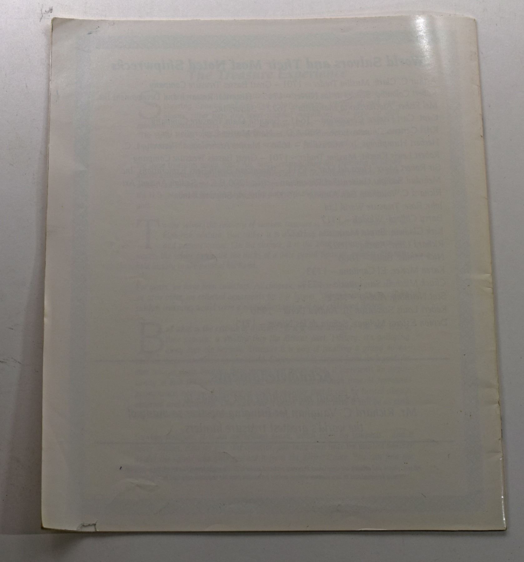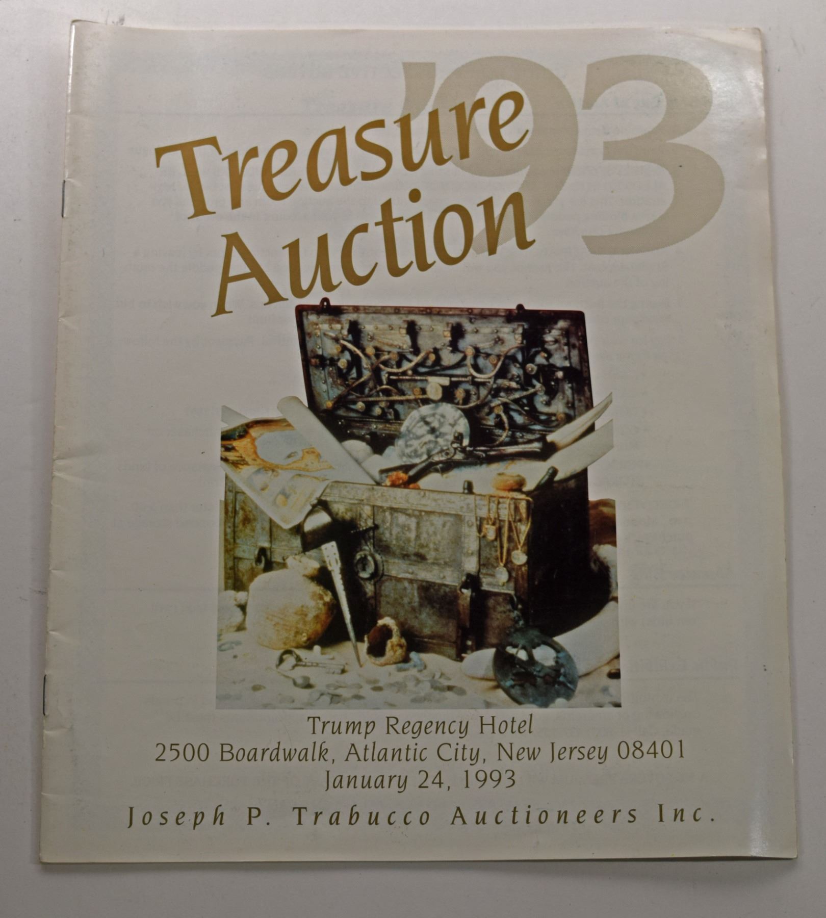 Joseph P. Trabucco Auctioneers, Inc. TREASURE AUCTION '93. January 24, 1993. 4to, 22 pages; Softcover; This auction catalog brought together artifacts, cannons, gold cobs, emeralds, jewelry (including Jack Haskins' spectacular 1733 Fleet Capitana medallion), Tumbaga bars, and gold and silver ingots from a multitude of shipwrecks. There are no lot numbers and the catalog is not organized by shipwreck. The ceramics offered from the “Flor do Mar” are extremely doubtful as most people believe this wreck has never been found, much less salvaged. The catalog has many color photos and includes a glossary. Subject: History - Sunken Treasure