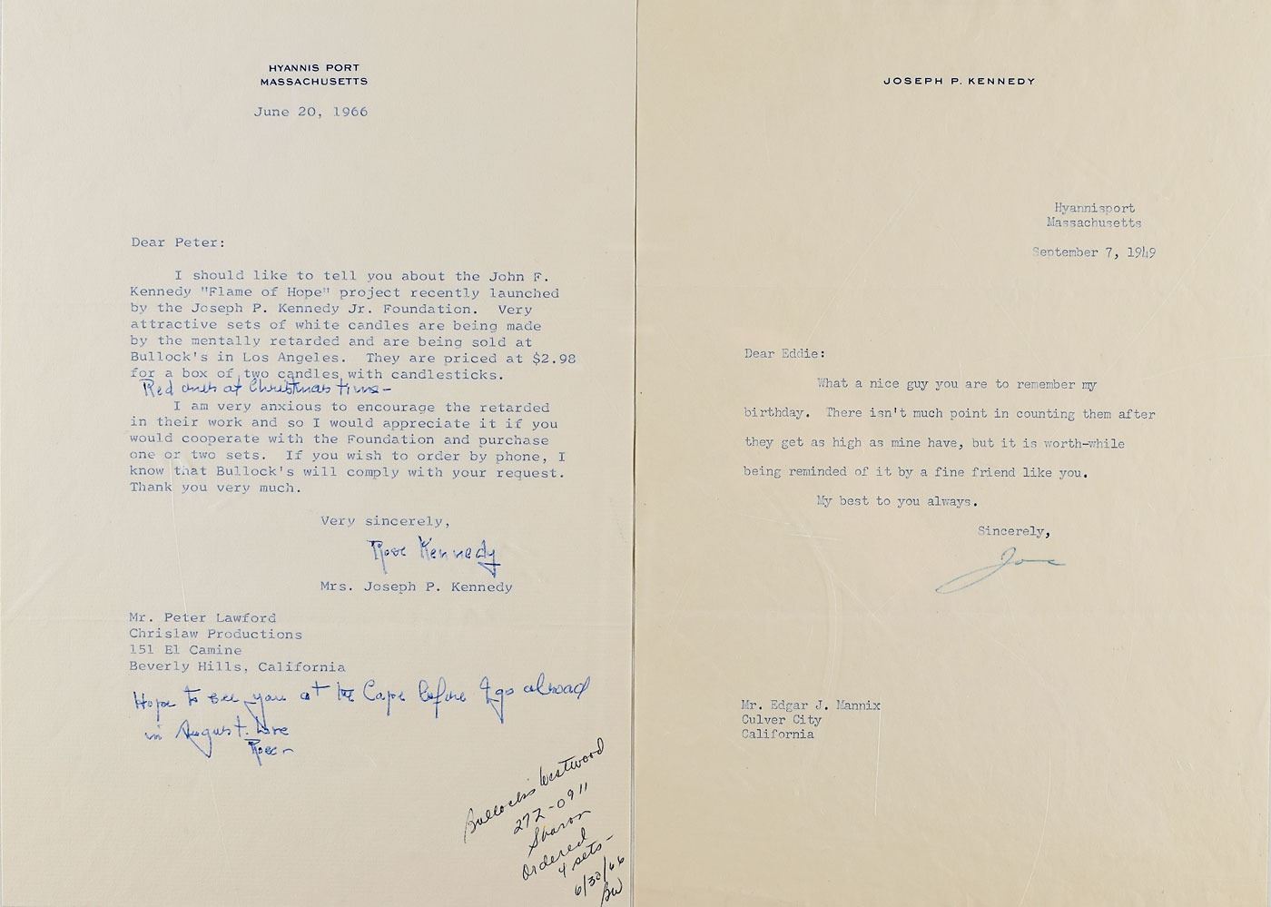 Two letters: a TLS signed "Joe," one page, 7.25 x 10.5, September 7, 1949, personal letterhead, addressed to film studio executive and producer Eddie Mannix, in full: "What a nice guy you are to remember my birthday. There isn't much point in counting them after they get as high as mine have, but it is worth-while being reminded of it by a fine friend like you"; and a TLS signed "Rose Kennedy," one page, 7.25 x 10.5, June 20, 1966, Hyannis Port stationery, addressed to Rat Pack member and former husband to Patricia Kennedy, Peter Lawford, in part: "I should like to tell you about the John F. Kennedy 'Flame of Hope' project recently launched by the Joseph P. Kennedy Jr. Foundation. Very attractive sets of white candles are being made by the mentally retarded and are being sold at Bullock's in Los Angeles…I am very anxious to encourage the retarded in their work and so I would appreciate it if you would cooperate with the Foundation and purchase one or two sets," with Rose adding in her own hand below: "Hope to see you at the Cape before I go abroad in August, Love, Rose." In overall fine condition.