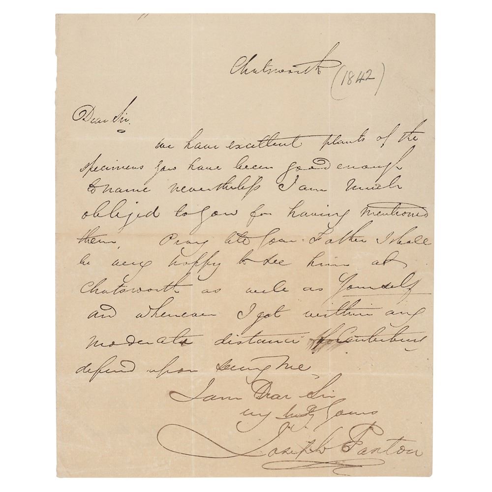 ALS, one page, 7.25 x 9, [no date but annotated 1842 in pencil]. Handwritten letter from Chatsworth, in part: "We have excellent plants of the specimens you have been good enough to name nevertheless I am much obliged to you for having mentioned them. Pray tell your father I shall be very happy to see him at Chatsworth as well as yourself, and whenever I got within any moderate distance to Canterbury depend on seeing me." In fine condition, with a couple tiny edge tears.