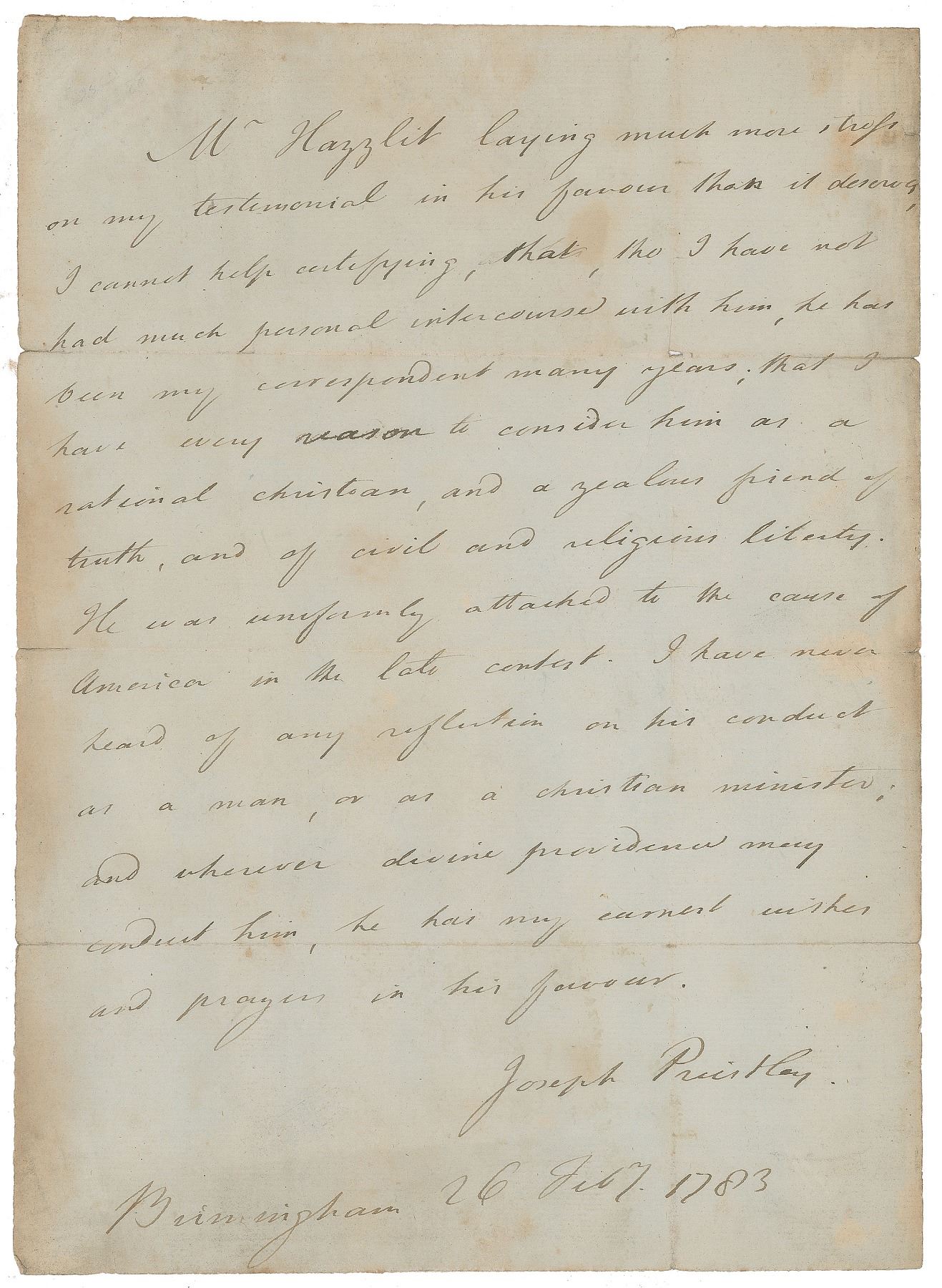 Rare ALS, one page, 8 x 11, February 26, 1783. Letter written from Birmingham, recommending the noted Unitarian minister William Hazlitt. In full: "Mr. Hazzlit laying much more stress on my testimonial in his favour than it deserves, I cannot help certifying, that, tho I have not had much personal intercourse with him, he has been my correspondent many years; that I have every reason to consider him as a rational Christian, and a zealous friend of truth, and of civil and religious liberty. He was uniformly attached to the cause of America in the late contest. I have never heard of any reflection on his conduct as a man, or as a Christian minister; and wherever divine providence may conduct him, he has my earnest wishes and prayers in his favour." In very good condition, with light staining and soiling, and old repairs to fold splits on the reverse.