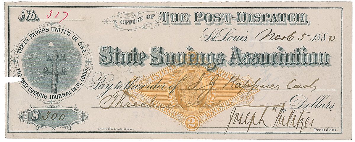 Uncommon Post-Dispatch business check, 8 x 3.25, filled out in another hand and signed by Pulitzer, payable to J. G. Kappner for $300.00, November 5, 1880. In fine condition, with a central vertical fold, cancellation cut to center, and a small area of paper loss to left edge.