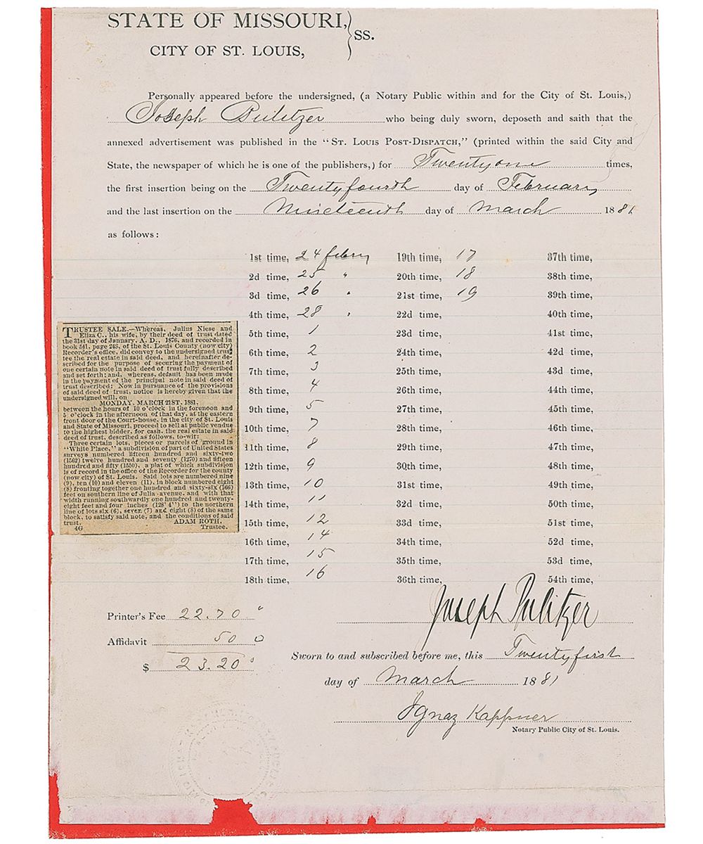 Partly-printed notarized DS one page, 8 x 10.5, March 21, 1881. Document from Pulitzer stating “the annexed advertisement was published in the St. Louis Dispatch…for Twenty one times,” with all 21 dates listed underneath. A copy of the ad is affixed to the left side. Document is affixed to a slightly larger sheet of red cardstock. Slightly trimmed top edge, and paper and surface loss to bottom, otherwise fine condition.