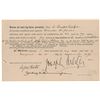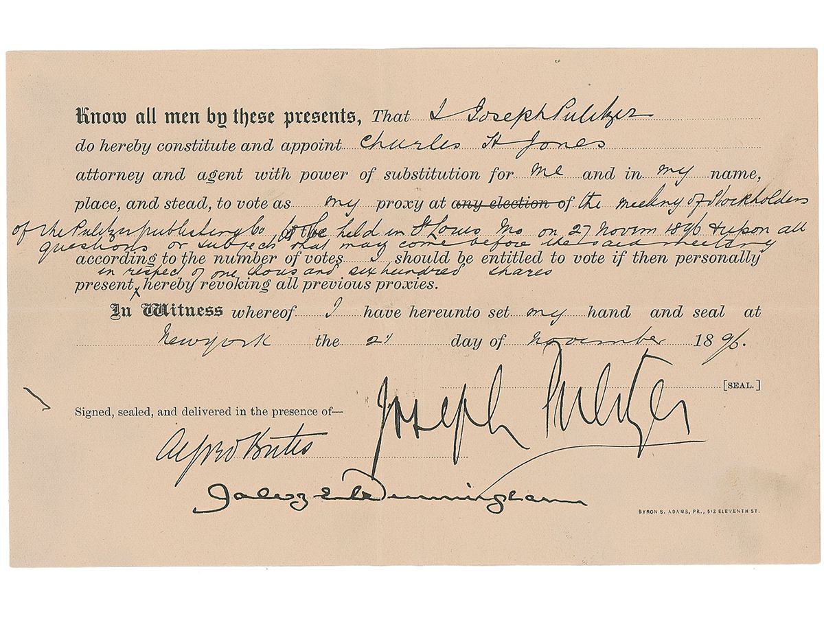 Partly-printed DS, one page, 7.75 x 5, November 2, 1896. Pulitzer appoints Charles H. Jones as a voting proxy at “the meeting of stockholders of the Pulitzer Publishing Co. to be held in St. Louis Mo on 27 Novem 1896.” In fine condition, with central vertical and horizontal folds, and some light creasing slightly affecting the signature. Jones had been appointed editor of the St. Louis Post-Dispatch in 1895.