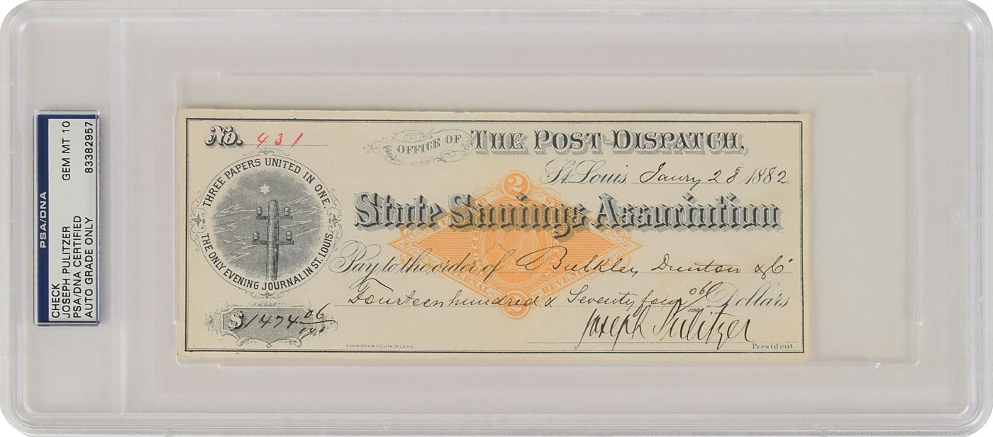 Journalist and newspaper publisher (1847–1911) who established the Pulitzer Prize 'for the encouragement of public service, public morals, American literature, and the advancement of education.' Office of the Post-Dispatch business check, 7.75 x 3, filled out in another hand and signed by Pulitzer, "Joseph Pulitzer," payable to Bulkley Dunton & Co. for $1474.06, January 28, 1882. Encapsulated in a plastic PSA/DNA authentication and grading holder, evaluating the autograph as "GEM MT 10." In fine condition. Bulkley Dunton & Co. was a New York–based paper supplier that likely provided the newsprint stock to Pulitzer's St. Louis Post-Dispatch.