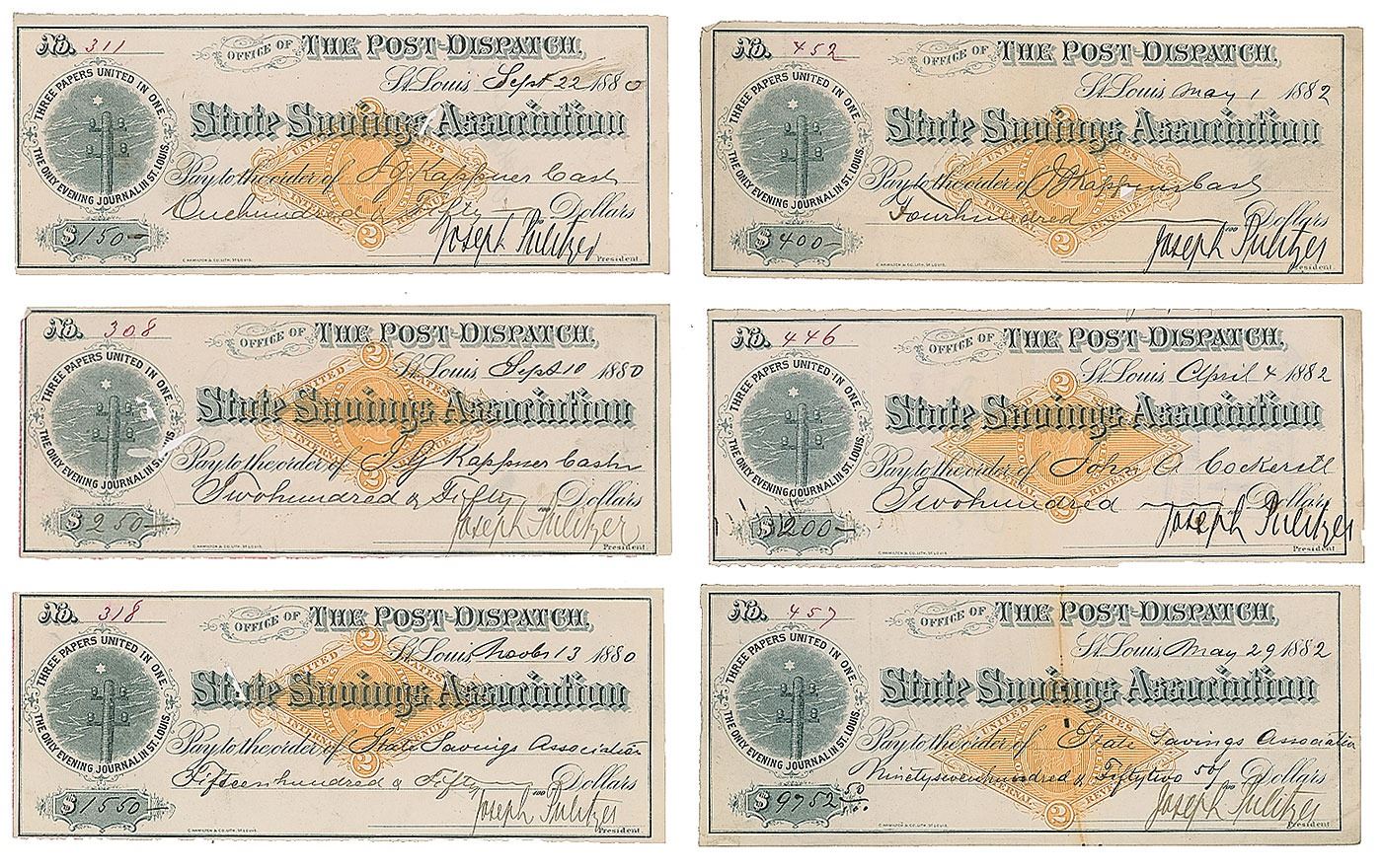 Collection of six Post-Dispatch business checks, each 8 x 3.25, filled out in another hand and signed by Pulitzer, dated between 1880 and 1882. In overall fine condition.