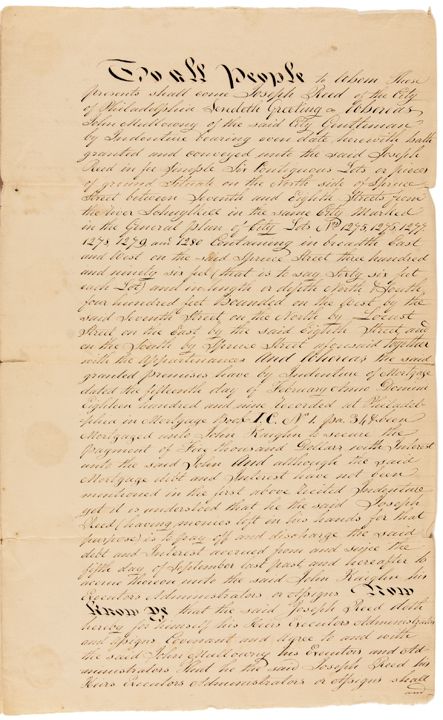 November 13, 1810-Dated, 2 page, Manuscript Document Signed, “Joseph Reed,” while Attorney General, Philadelphia, PA, and also by “John Barker,” twice as Witness, being a legal agreement, Choice Very Fine. The docket reads: “Covenant - Joseph Reed Esq. with John Mullowny, being nicely written in dark brown ink on period wove paper, having excellent signatures and overall eye appeal. In it, Reed covenants to bind himself (via a $5,000 bond) to a mortgage on property sold by Mullowny to a John Kaighn. Apparently, when the property was originally conveyed, Reed agreed to bind himself financially on the sale, but it seems that the original paperwork didn't specify this point and Mullowny wanted to "get it in writing" via the execution of this legal document. John Mullowny (1769-30) [also spelled Mullowney] who was the famed Drummer Boy at the Battle of Monmouth, US Navy Captain, and later the US Consul in Tangiers.