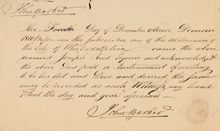 Major General John Barker, who signs as a witness and alderman (Justice) was twice Mayor of Philadelphia. A tailor by trade, Barker served in the Revolutionary War and remained active in the military through 1808, when he retired as Major General of the First Brigade, First Division, PA Militia. He served twice as sheriff of Philadelphia, from (1794-97 and from 1803-07). He was appointed an Alderman of the city of Philadelphia in 1800 and signs this document in that capacity. He served as Mayor in 1808, 1809, and 1812. During the War of 1812 he served on the city's Committee of Defense. He died in Philadelphia at age 72.