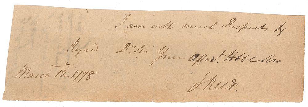 A president of the Continental Congress and signer of the Articles of Confederation (1741–1785), who also served as Washington’s aide-de-camp during the Revolutionary War. Ink signature, “I am with much Respects etc Dr Sir, Your Affect & Hble Serv, J. Reed,” on an off-white 6.5 x 2 slip clipped from the closing of a letter, dated March 12, 1778. In very good condition, with intersecting folds, one horizontal fold passing through the signature, scattered toning, and some show-through from writing to the reverse.