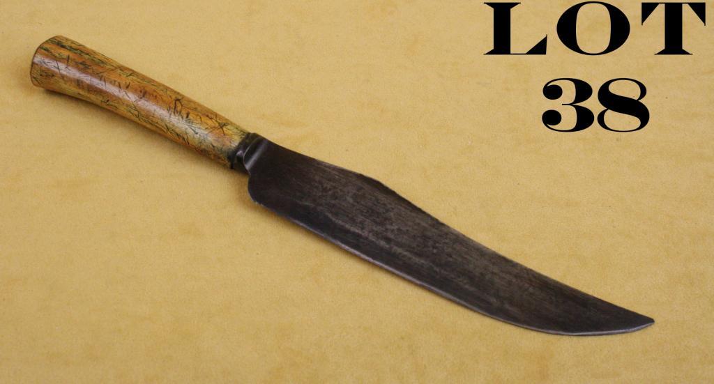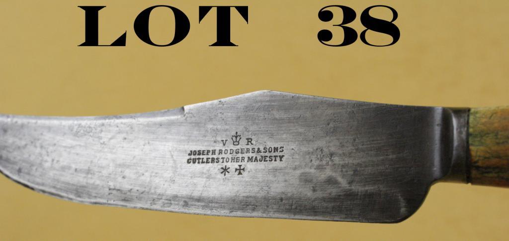 Joseph Rodgers & Sons, cutlers to Her Majesty marked clip point knife, approx. 10” overall with an approx. 6” blade. The blade shows some old cleaning and slight sharpening, the markings are clear and the grip is nicelyworn stag horn. Est.: $100-$200.