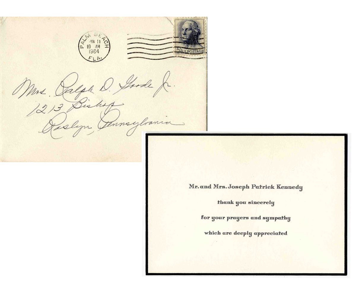 Joseph & Rose Kennedy printed thank you card, expressing thanks for condolences sent after JFK's tragic death. Postmarked from Palm Beach, Florida on 11 January 1964, card reads: ''Mr. and Mrs. Joesph Patrick Kennedy thank you sincerely for your prayers and sympathy which are deeply appreciated''. Envelope is addressed in cursive to a Mrs. Ralph D. Good Jr. in Roslyn, Pennsylvania. Cream colored card with elegant black font and trim measures 5.25'' x 3.75'', in fine condition.