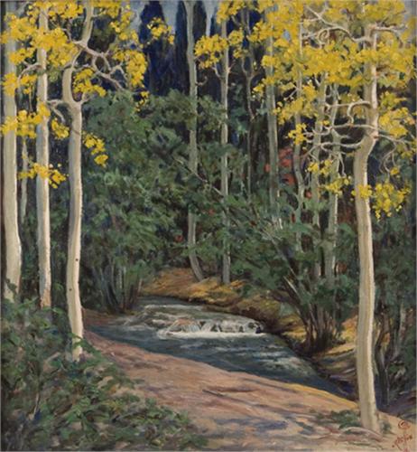Joseph Roy (J.R.) Willis (1876-1960). Mountain Stream with Aspens, Aroya Hondo - near Taos. 21" x 20" oil on board. Signed lower right. (est $3,500-4,500)