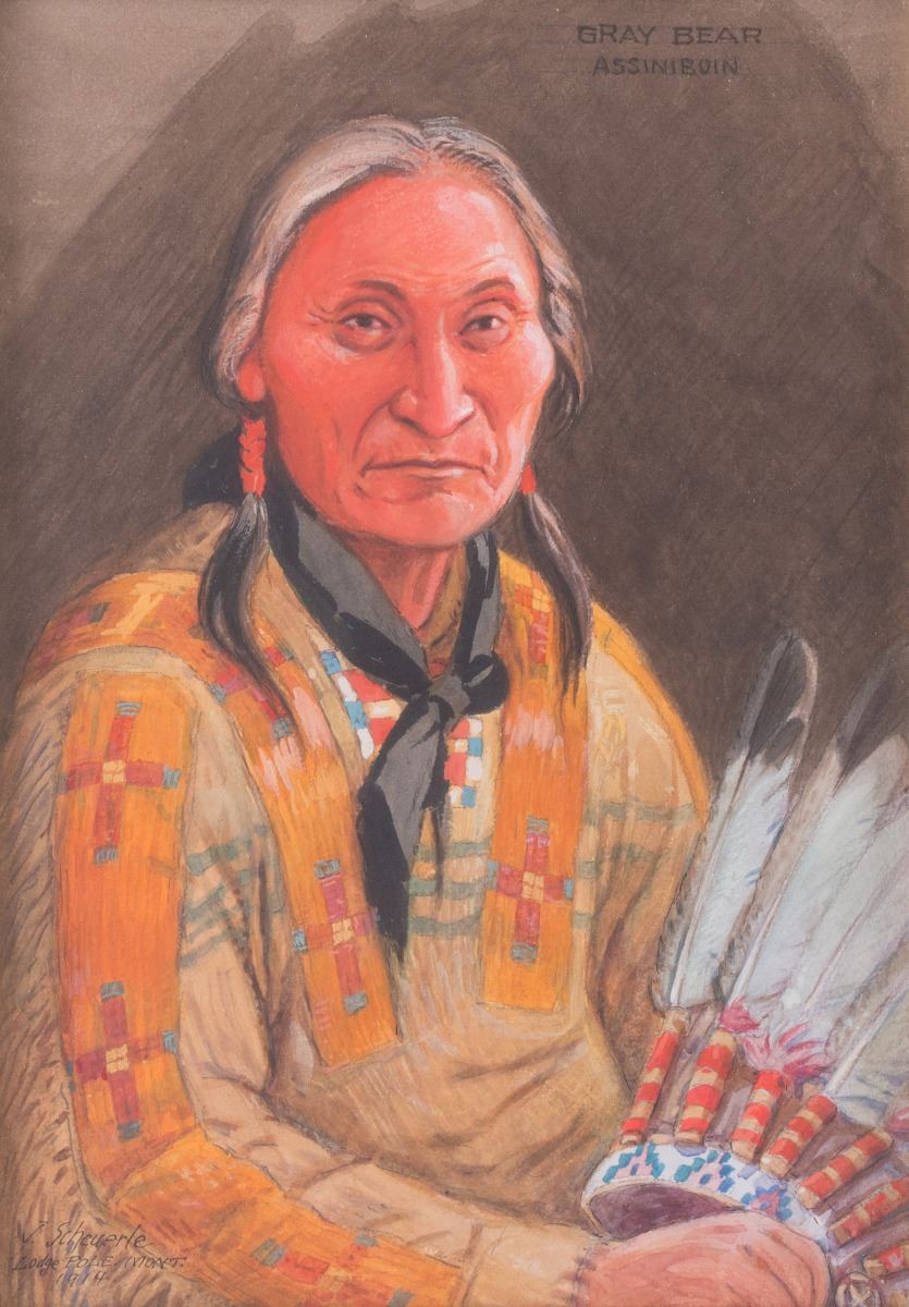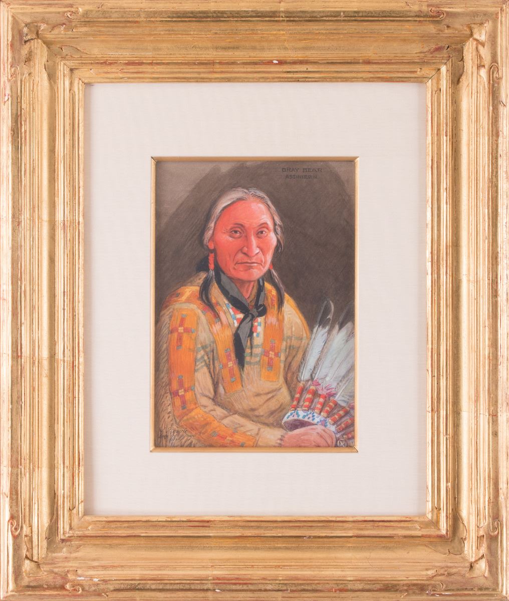 Joseph Scheuerle (1873-1948). Gray Bear Assiniboin Chief. 13" x 9" gouache. Signed and dated 1914 lower left. Titled upper right