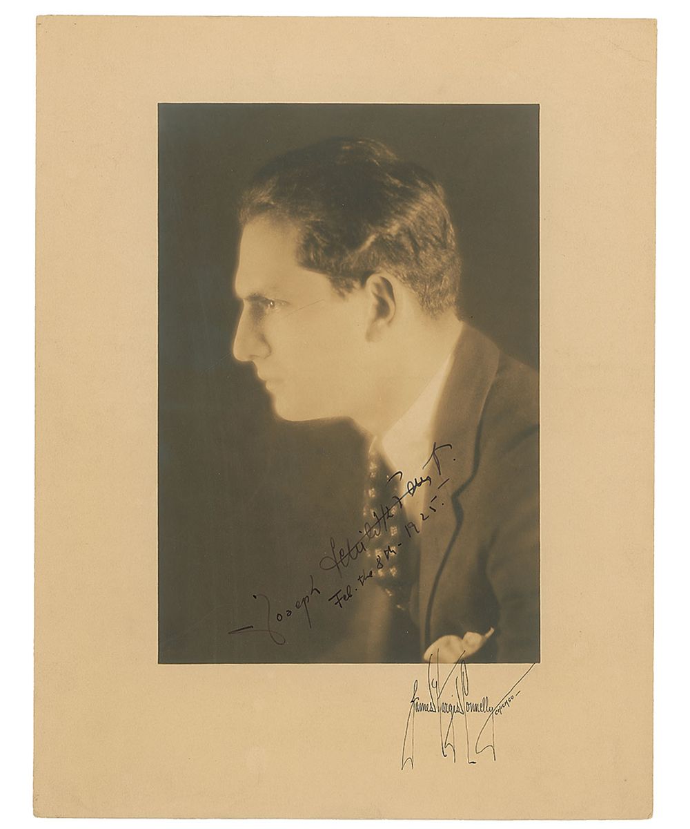 Viennese-born actor (1896–1964) who won an Academy Award for his role in the 1937 film The Life of Emile Zola. Vintage matte-finish 10.5 x 13.5 portrait of Schildkraut in profile, signed in fountain pen, “Joseph Schildkraut, Feb. The 8th, 1925.” Also signed in the lower right by the photographer, James Hargis Connelly of Chicago. In fine condition.