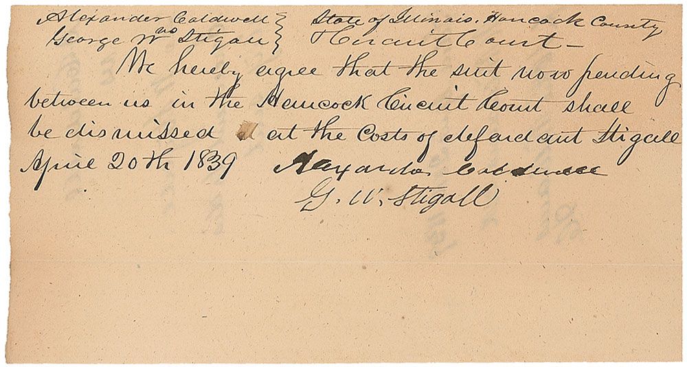 Manuscript DS, signed “Alexander Caldwell and G. W. Stigall,” one page, 7 x 4, April 20, 1839. Legal document reads, in full: “We hereby agree that the suit now pending between us in the Hancock Circuit Court shall be dismissed at the Costs of defendant Stigall.” Docketed on the reverse, “A. Caldwell / vs / Geo W Stigall / Agreement to dis / miss suit / Filed April 20th 1839 / W Williams clk / pr S Otho Williams / DC,” all in the handwriting of Deputy Clerk Samuel Otho Williams. In fine condition. George W. Stigall was the jailer at Carthage Jail, where the Prophet Joseph Smith and his brother Hyrum were murdered by an angry mob on June 27, 1844. Reportedly an admirer of the prisoners who he knew were innocent, Stigall allowed them to stay in his comfortable bedroom rather than the jail cell. Hearing of the impending danger to the lives of the prisoners, Stigall suggested that they move to the inner cell, where they would be safer—it was too late, however, and the mob closed in before the Smiths were able to seek further refuge.