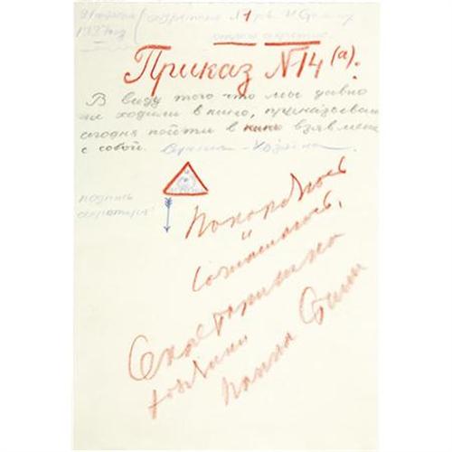 <B>Joseph Stalin Autograph Note Signed, In Response to a Request from His Daughter, Svetlana, a.k.a. “Setanka the Hostess”</B></I>. One page, 5” x 7.5”, in Russian, September 21, 1937. This rare, unusual document with personal content shows a “lighter side” of the formidable Soviet dictator Joseph Stalin (1878-1953). Stalin spoiled his only daughter, Svetlana (b. 1926), who began issuing “Orders of the Day” for him in 1937. In these father-and-daughter correspondences, Svetlana is referred to as “Setanka the Hostess.” This document, her Order Number 14, includes both her request and his reply. The top half of the document reads in full: <I>“To: Secretary N1 comrade I. Stalin / Strictly confidential / 21 September 1937 / ORDER N 14 (a) / Taking into account the fact that we haven’t been to the cinema for a long time I order to go to the cinema today and take me along. Setanka the Hostess.”</B></I> Her hand-drawn, triangular stamp is followed by Stalin’s reply in full: <I>“I humbly obey and agree. The humble Secretary of the Hostess / Daddy Stalin</B></I>” This rare document is in fine condition with no discernible defects; the top edge shows that the paper was removed from a tablet.<BR><BR><b>Shipping:</b> Flat Material, Small (<a target="_blank" href="http://www.heritageauctions.com/common/shipping.php">view shipping information</a>)