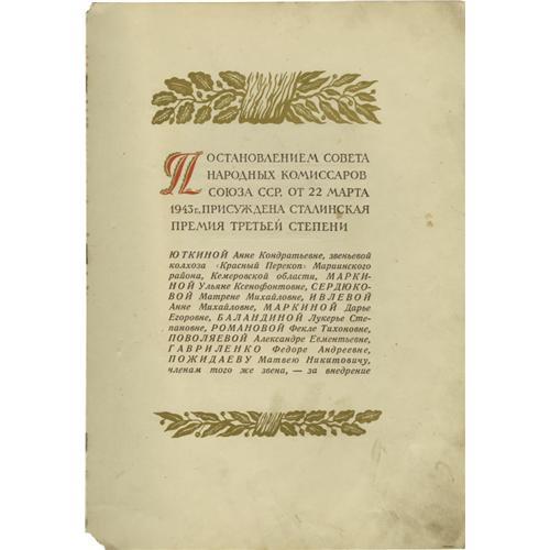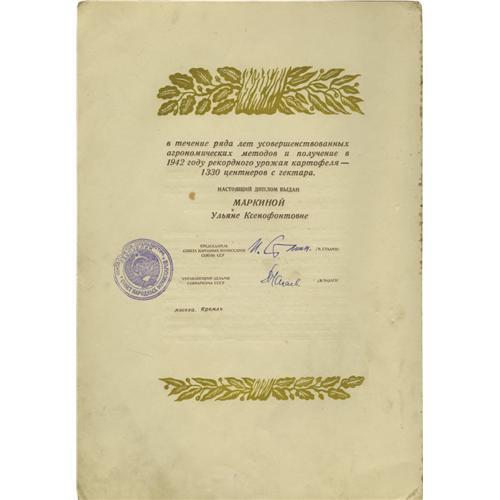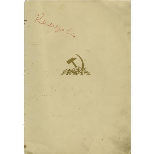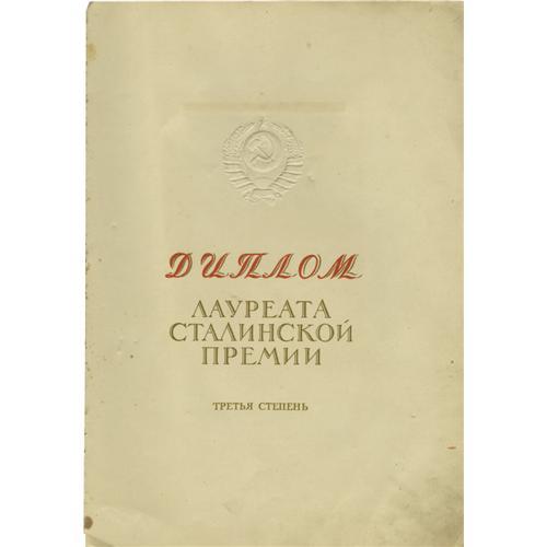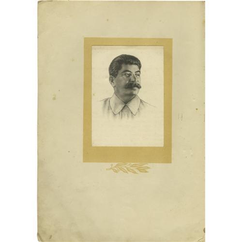 <B>Joseph Stalin Document Signed </B></I> <I> "I. Stalin," </B></I> (In Russian). Seven pages, 9.75" x 14", The Kremlin, Moscow, March 22nd, 1943. Joseph Stalin was the Premiere of the Soviet Union from 1941 until his death in 1953 and General Secretary of the Central Committee of the Communist Party of the Soviet Union from 1922-1953. Stalin took on this role after the death of Lenin and after eliminating his political rivals. This personalized printed document signed "I. Stalin" in blue ink. Enclosed in hard off-white folder with gilded bas-relief of the hammer and sickle of the Communist party, and impressed gold lettering "To a Winner of the Stalin Prize, third degree". The certificate has 7 pages showing embossed Soviet state emblem of pre-1948 type - with 11 republics in the Soviet Union. Stalin's portrait is featured on the fourth page, opposite the text page listing each of the 11 recipients of that year's Stalin Prize. On the sixth page is a Citation from the Sovnarkom (Council of People's Commissars), followed by the printed line saying that this particular diploma was issued to Julian Xenophonemov [?]. On the same page (page 6) Joseph Stalin signs his name as, the Chairman of Sovnarkom, as does Chadaev, Chief Supervisor for the Affairs of Sovnarkom. <BR> The document is in fine condition; some pages are separating from the binding; covers are soiled.