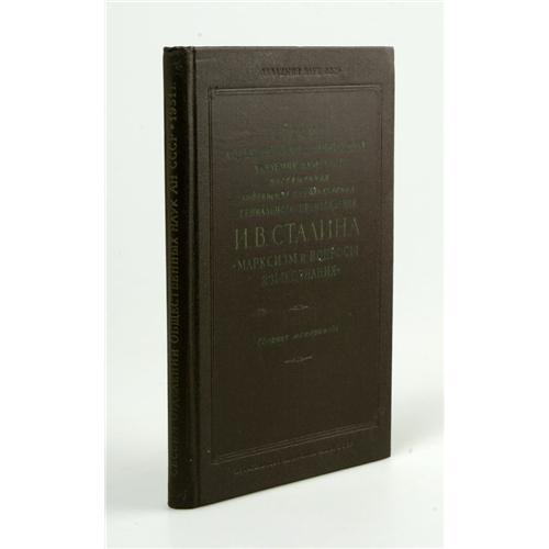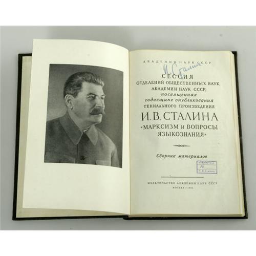 <B>Joseph Stalin Signed Book: Session of the Academy of Science USSR Dedicated to the Anniversary of the Brilliant Work of JV Stalin 'Marxism and Linguistics Issues,</B></I> (Moscow, 1951), 221 pages, original gold stamped cloth binding. Stalin's bold signature is on the title page, along with a handstamp imprint from his personal library. This is one of the few autographed books from Stalin's library that is in private hands, and as such, it is very rare. Despite his ruthless villainy, Stalin must be considered one of the most influential men of the 20th century's first half. Fine condition. <BR><BR><B>Important noti