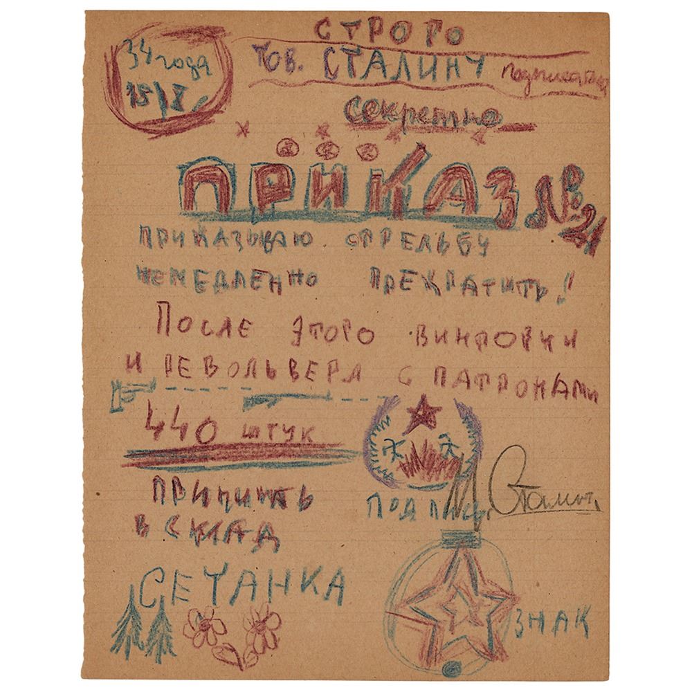 Unique hand-drawn 'official order' from Stalin's daughter endorsed at the conclusion by the Russian ruler, one page, 6.75 x 8.75, 1934. One of Svetlana Stalina's playful 'official orders' to her father, Joseph Stalin, handwritten in Cyrillic in blue and red pencil, with a decorative emblem and flourishes. At the top, Svetlana has drawn "Top Secret," with "Order #21" below. She writes: "Order you to stop shooting. All 440 guns and revolvers with ammo should be moved to warehouse." Beneath that, Joseph Stalin endorses the order in black pencil. In fine condition. Svetlana wrote about these notes to her father in her autobiography, Twenty Letters to a Friend.