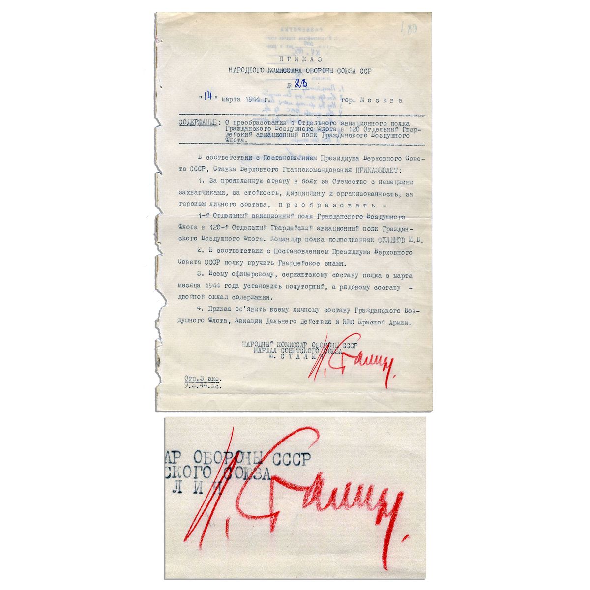 Joseph Stalin signs a WWII wartime order as People's Commissar of Defense, concerning the creation of a new position of Vice Commander of the Front Artillery for Russia's expanding military. The order, typed in Russian, is signed in red wax pencil and translates, ''In order to improve the fighting abilities of artillery, to strengthen the control upon artillery works in the armies, as well as to raise new personnel of Artillery High Commander's staff, I ORDER: To create a position of Vice Commander of Artillery Front in the Board of Commanders Staff of the Front Artillery (with monthly fee 2,400 rubles) and a car…People's Commissar or Defense Marshal of the Soviet Union, [signed] J. Stalin.'' Numerals are written in blue ink in an unknown hand on the letterhead, and verso is rubber stamped. Single-page document measures 8'' x 11.5''. A horizontal crease along the bottom margin and small tears along the left edge, else near fine. Very rare WWII document signed by the Soviet dictator.
