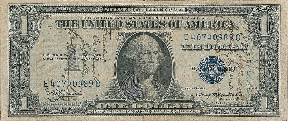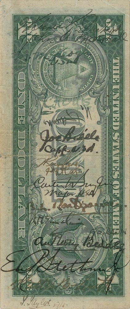 Series 1935 A one dollar 'short snorter' silver certificate, signed on the front and back in ink and fountain pen by twenty-two notable figures, including: Harry S. Truman, Joseph Stalin, Bernard M. Baruch, Frank Lauro, Bernard Law Montgomery, Cardinal Francis Spellman, John A. Marshall, Michael McKeogh, Leslie Hollis, Joe Biddle, R. M. Sinclair, Anthony Biddle, Edward R. Stettinus, Jr., and others. In fine condition, with expected wear and moderate contrast to parts of Truman's signature.