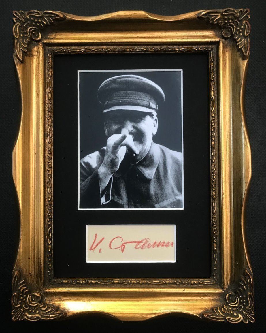 Joseph Vissarionovich Stalin was a Georgian revolutionary and Soviet politician who led the Soviet Union from the mid–1920s until 1953 as General Secretary of the Communist Party of the Soviet Union and Premier. Starlin's autograph mounted and framed (In a different frame).