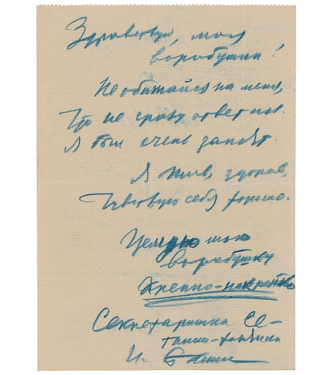 ALS in Russian, boldly written in blue pencil, signed “Secretary of Housekeeper Setanka. J.Stalin,” one page, 5.25 x 7.75, no date. Letter to his daughter, Svetlana whom he calls “Setanka.” In full (translated): “Hello. My Little Sparrow! Don’t be angry with me for not answering right away. I was very busy. I’m alive and well. I feel fine. I give my Little Sparrow a big hug.” In fine condition, with some scattered light creases. Any Stalin correspondence is unusually rare and highly desirable.