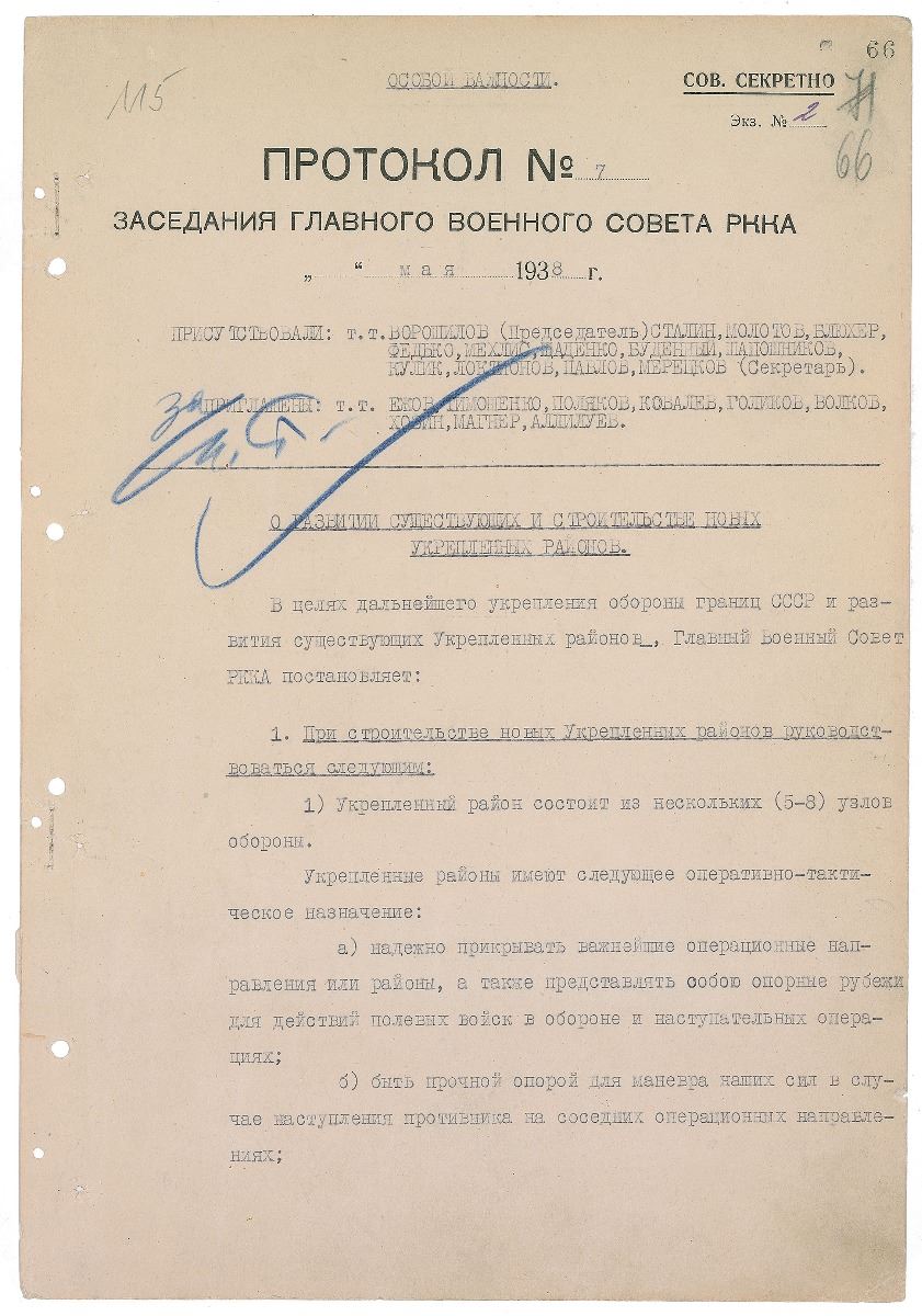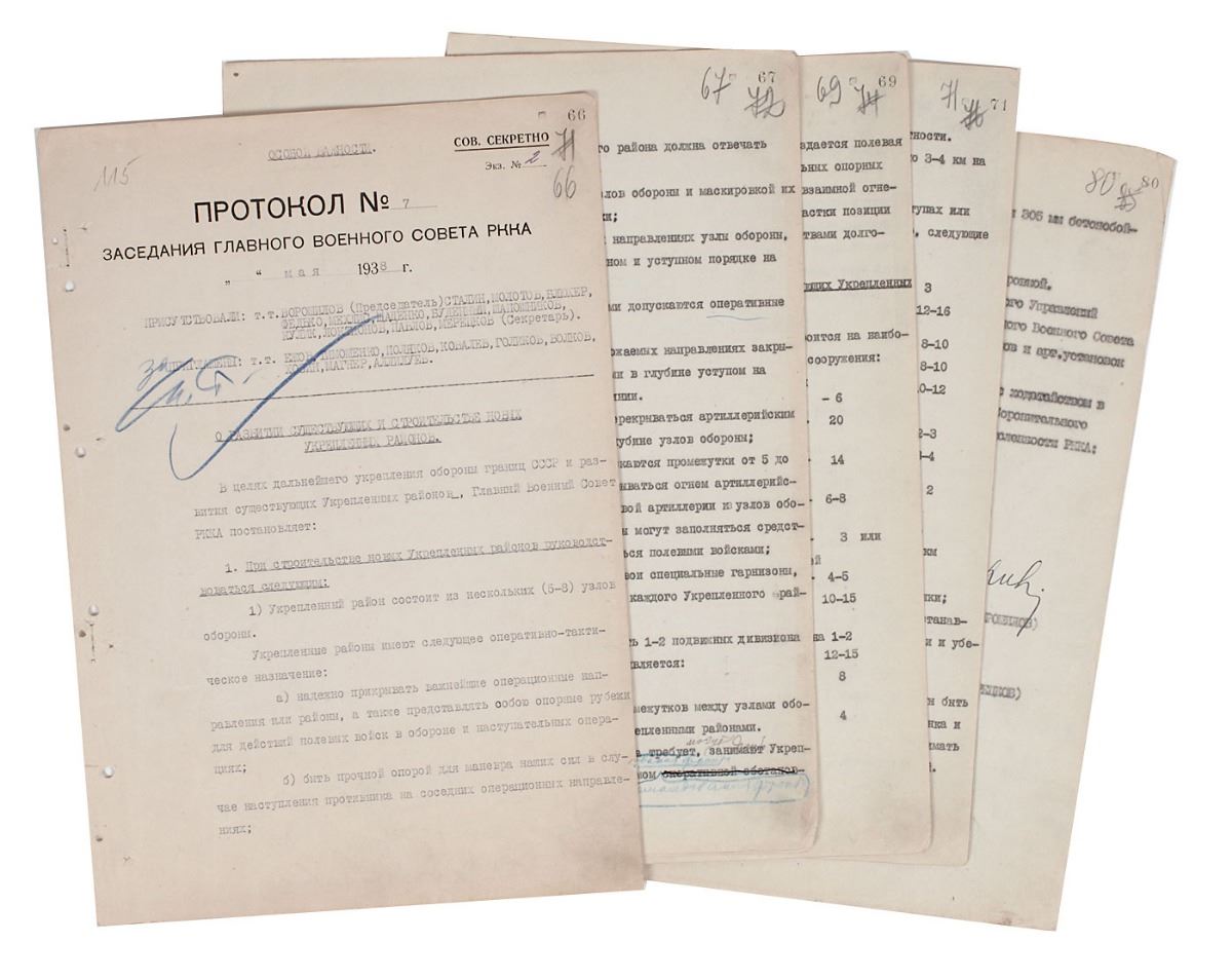 Lengthy DS in Cyrillic, signed on the first page in blue pencil by Stalin, fifteen pages, 8.5 x 12, May 1938. Top secret minutes of a meeting of the Main Military Council of the Workers’ and Peasants’ Red Army (WPRA). A remarkable document outlining plans and requirements for “the purpose of reinforcing the defense of the borders of the USSR and expanding existing Fortified Localities.” Among the guidelines established for the construction of new fortifications are: “1) Fortified Localities shall have the following operational-tactical purpose: a) to reliably safeguard major operation routes or areas, as well as to serve as strongholds for field force defensive actions and offensive operations, and; b) to serve as a secure foothold for the maneuvers of our forces in the event of an enemy offensive against adjacent operation routes…2) A center of resistance must be the mainstay of a Fortified Locality and must in all instances have the perimeter defense of both the center as a whole and the strongholds that comprise it.…A center of resistance must have a reliable perimeter system of antipersonnel and antitank obstacles, which shall be erected along major routes during peacetime and along other routes during a mobilization period, to which end a detailed plan must be prepared, and all the necessary building materials, wire, mines, and so forth must be procured during peacetime. A combat outpost field position shall be created 1-3 km ahead of the forward edge of centers of resistance, which shall consist of individual strongholds (a platoon per two branches) that share mutual fire support. The most important individual sections of a combat outpost position shall be outfitted in advance with permanent field fortification equipment.” The document lists a variety of the features required, including “artillery/machine-gun caponiers (45-mm guns paired with machine guns),” “reinforced-concrete points with frontal shelling,” “casemated heavy batteries (4 weapons each) of 107- or 122-mm guns,” “searchlight shelters,” “underground shelters for center-of-resistance forces and field forces,” and “underground connecting tunnels—depending upon the terrain.”