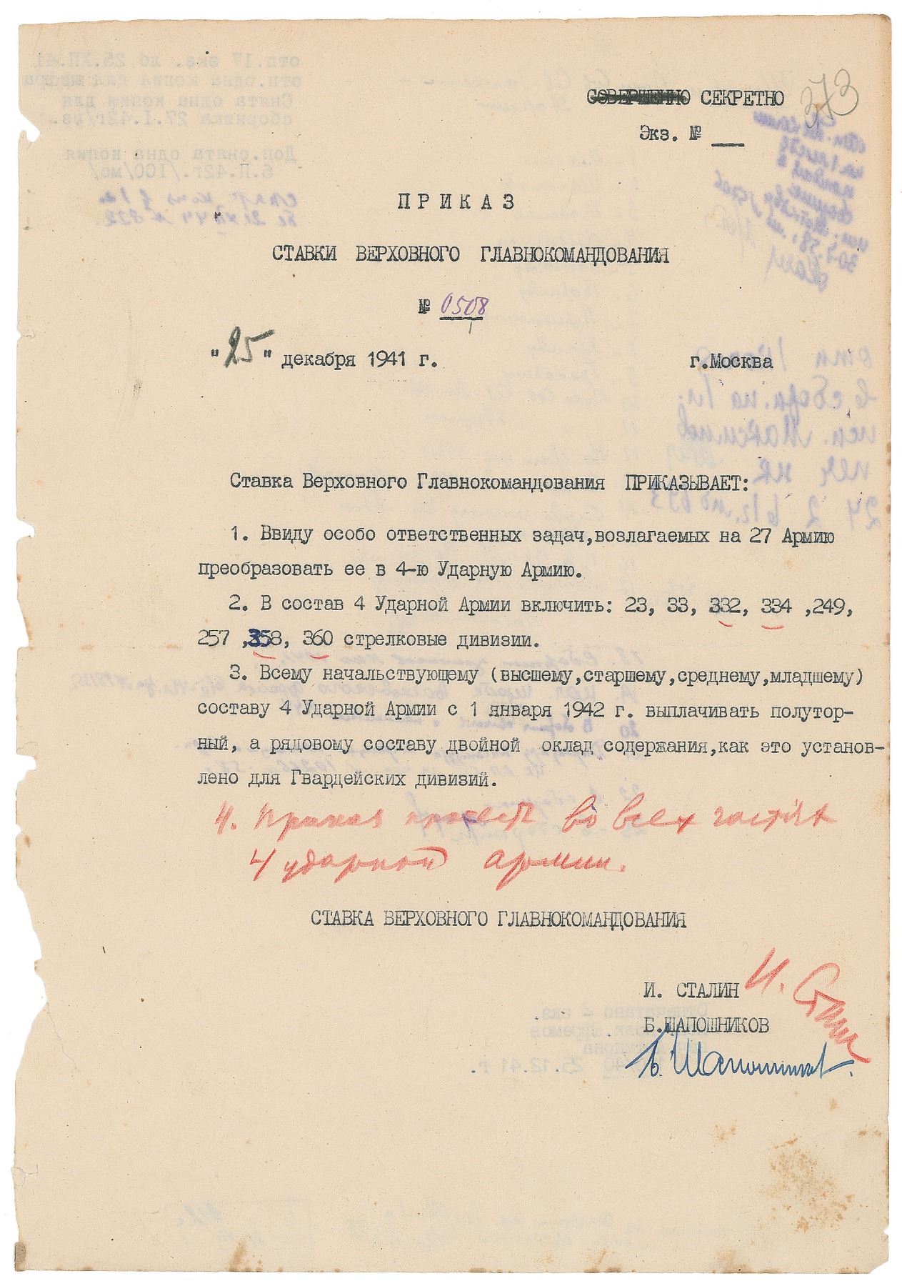 Fabulous World War II-dated DS in Cyrillic, signed in red pencil, one page both sides, 8.25 x 12, December 25, 1941. Stalin emends the document by adding a fourth line in red pencil. In very good to fine condition, with some light staining, paper loss along the left edge, and writing showing through from various notations on the reverse. A very rare example boasting much of Stalin's handwriting.